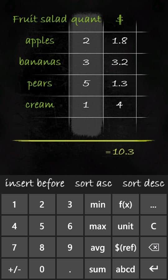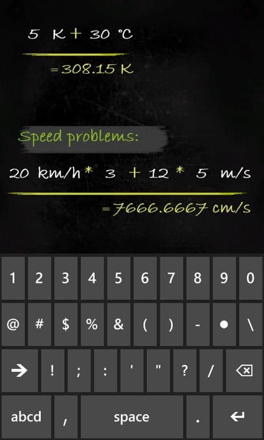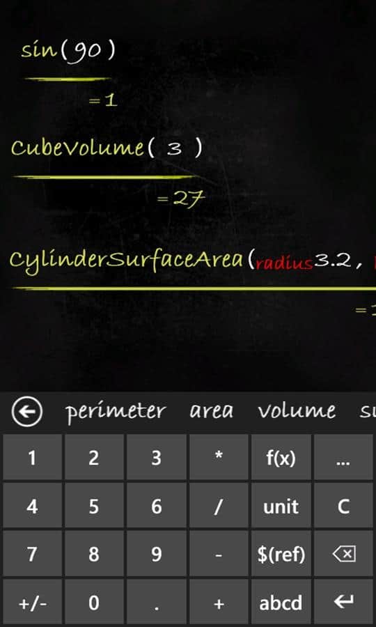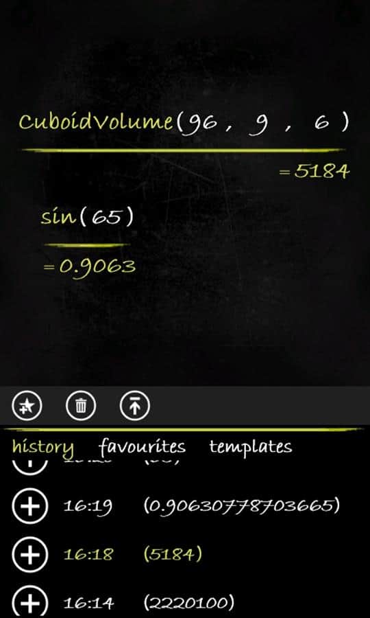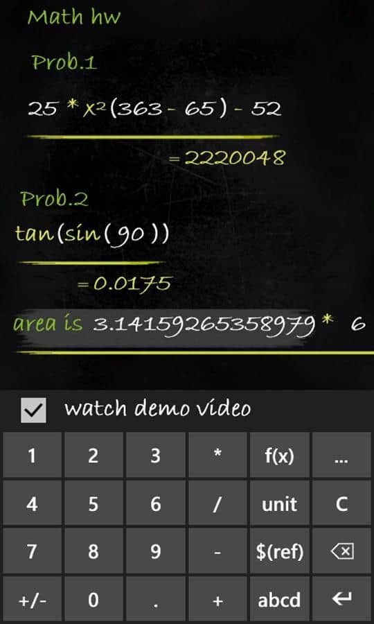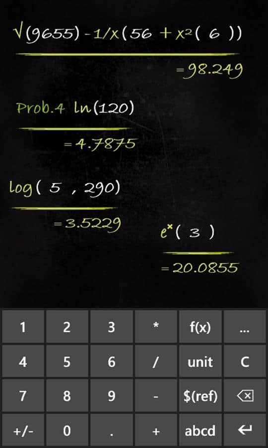 Calculadora Smartboard - muchas calculadoras funcionales para Windows Phone. Calculadora - Pizarra, que puedes usar para resolver ejemplos de álgebra, geometría, trigonometría y estadística; además, hay unidades de tiempo, distancia, velocidad, peso, temperatura, energía, presión y más. La peculiaridad de esta calculadora es que ves todas las expresiones y resultados, como en la pizarra. Todos los cálculos que escribas, en cualquier momento puedes restaurar la historia. Calculadora original que quieres mostrar a tus amigos.