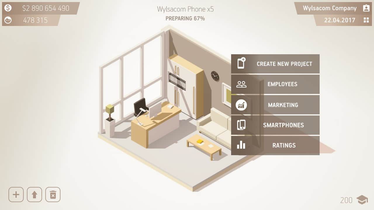 Smartphone Tycoon - simulador de negocios económicos en el que tendrás que dirigir la empresa en la producción de smartphones, mientras tu tarea no solo es crear un área industrial, sino también desarrollar el dispositivo desde cero. Con esto a tu disposición tendrás una enorme cantidad de diferentes tecnologías, características e innovaciones. Así que el éxito de tu empresa dependerá únicamente de tu imaginación y agudeza económica. Bueno, tu objetivo principal será lograr el reconocimiento y llevar a la empresa al Olimpo del mercado global.