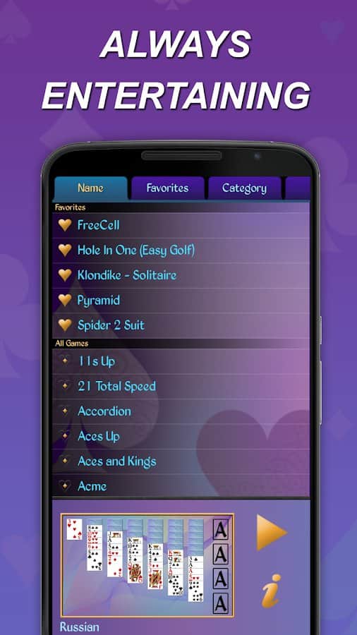 Solitaire MegaPack – gran colección de juegos de cartas para Android, donde cada uno puede encontrar un juego para sí mismo. En esta colección se encuentran juegos de solitario tan conocidos como Klondike, FreeCell, Golf, Churchill, Canfield, cuarenta ladrones, poker cuadrado, boliche, pirámide, tri picos, spider, casino Klondike, Escorpión y muchos otros. Las principales características del juego son: mover el panel de juego, puntuación y reporte de tiempo, en orientación vertical y horizontal, muchas opciones de fondos y camisas, devoluciones y cancelaciones ilimitadas, así como un funcionamiento suave del juego. Juega a este juego y disfruta al máximo de la experiencia de juego.