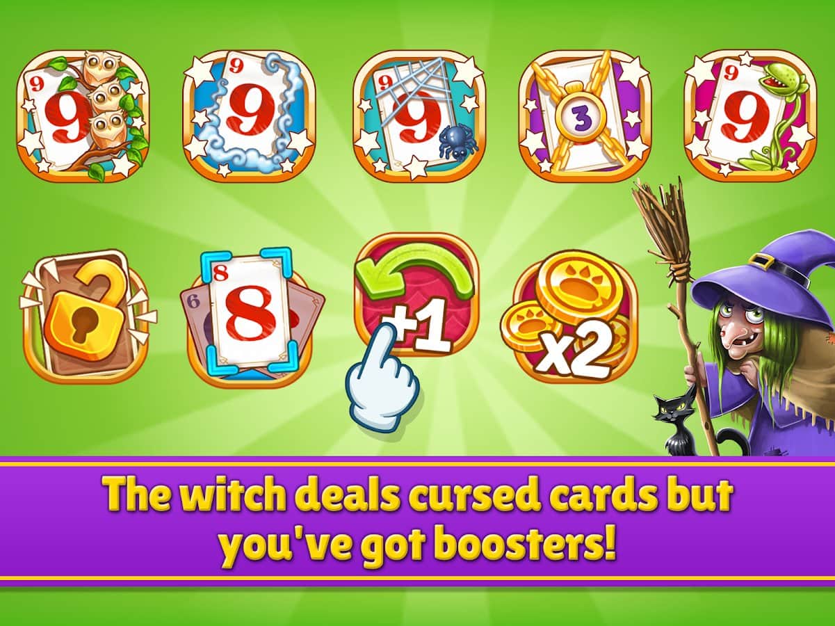 Story Solitaire - Tri Peaks – brillante juego de cartas en Android donde jugarás paciencia. Si te gusta el solitario tipo golf, spider, tri peaks, klondike o pirámide, entonces este juego es para ti. En este juego, tu tarea principal es derrotar a la malvada bruja que tiene una baraja mágica llena de trucos, ilusiones y misterios. Tu tarea será encontrar bloques de las mismas cartas y retirarlas. Compite con amigos por los mejores resultados y utiliza varios bonificaciones y potenciadores. Rompe los huevos con sorpresas y consigue los premios tan esperados. Escala más alto en la tabla de clasificación y mantén un lugar destacado.