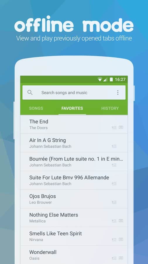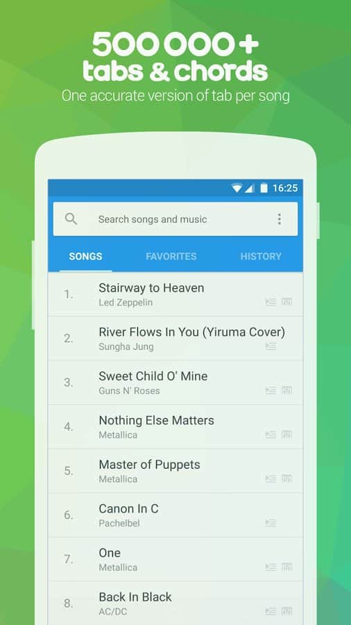 - Búsqueda. Búsqueda fácil de pestañas por título o artista.