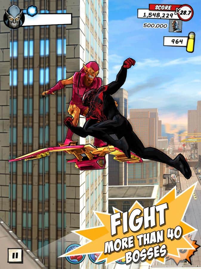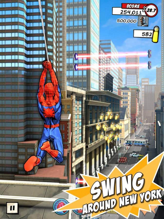 Perfecto Spiderman - un corredor divertido desarrollado por "Gameloft" que puedes jugar con todos los famosos héroes de cómic de Marvel – Spider-Man. En el juego te encontrarás incluso con una araña hembra. Corriendo por una enorme metrópolis, recoge los bonificaciones y monedas y lucha contra diferentes enemigos en cinco partes de Manhattan. Con la telaraña podemos movernos rápidamente de un lugar a otro. Además, el juego tiene un gran número de jefes que has marcado). A lo largo de más de 25 niveles lucharás contra el mal. Desbloquea nuevos personajes y limpia la ciudad de todos los bandidos.