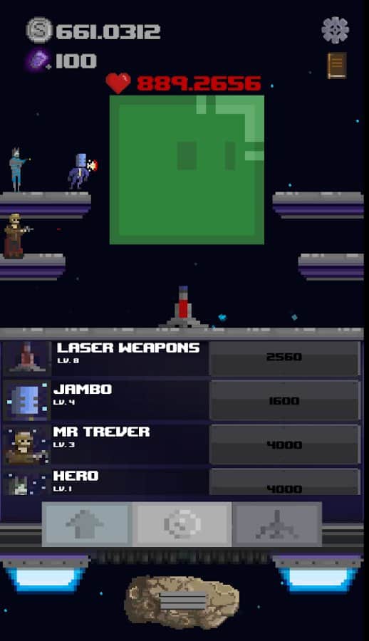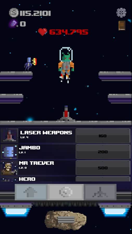 Space Savior – juego de rol en Android, en el género del juego donde ayudarás a los astronautas a destruir a los monstruos. Este juego de píxeles te llevará al espacio, donde tu tarea es hacer clic en la pantalla de tu dispositivo tan a menudo como sea posible para destruir todas las criaturas hostiles que quieren capturar tu planeta. Comanda una nave espacial StarShip y ayuda a los astronautas a derrotar a los monstruos y a otros seres espaciales que han tomado tu lado y luchan contra los monstruos. Mejora y mejora tu nave.