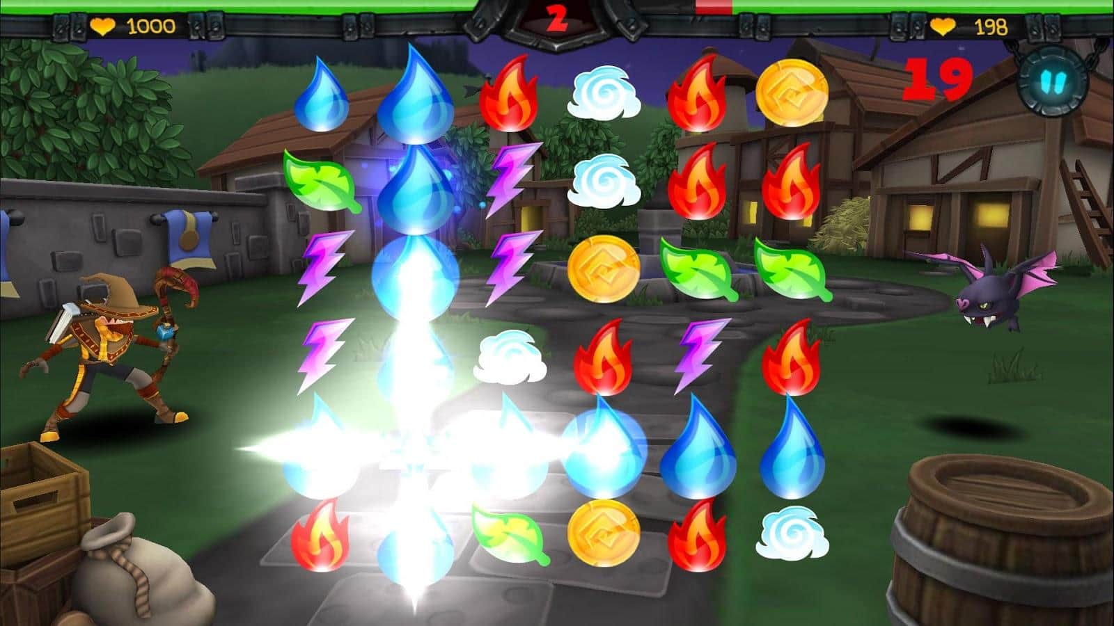 Spellfall - Aventura de Rompecabezas - un juego de rompecabezas en el que debes alinear figuras en fila y así vencer a un malvado monstruo. Actuarás como un joven mago que debe dominar nuevos hechizos y convertirse en un verdadero hechicero para derrotar al enemigo. Une tres o más baldosas iguales y aplica hechizos de fuego, agua, viento y tormenta, y asesta un golpe más poderoso al monstruo. Al vencer al villano, recibirás recompensas en forma de armas, habilidades especiales y poderes mágicos adicionales.