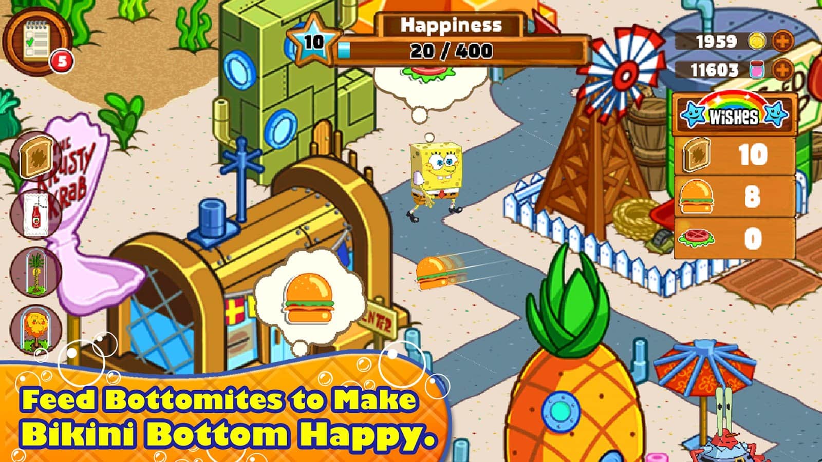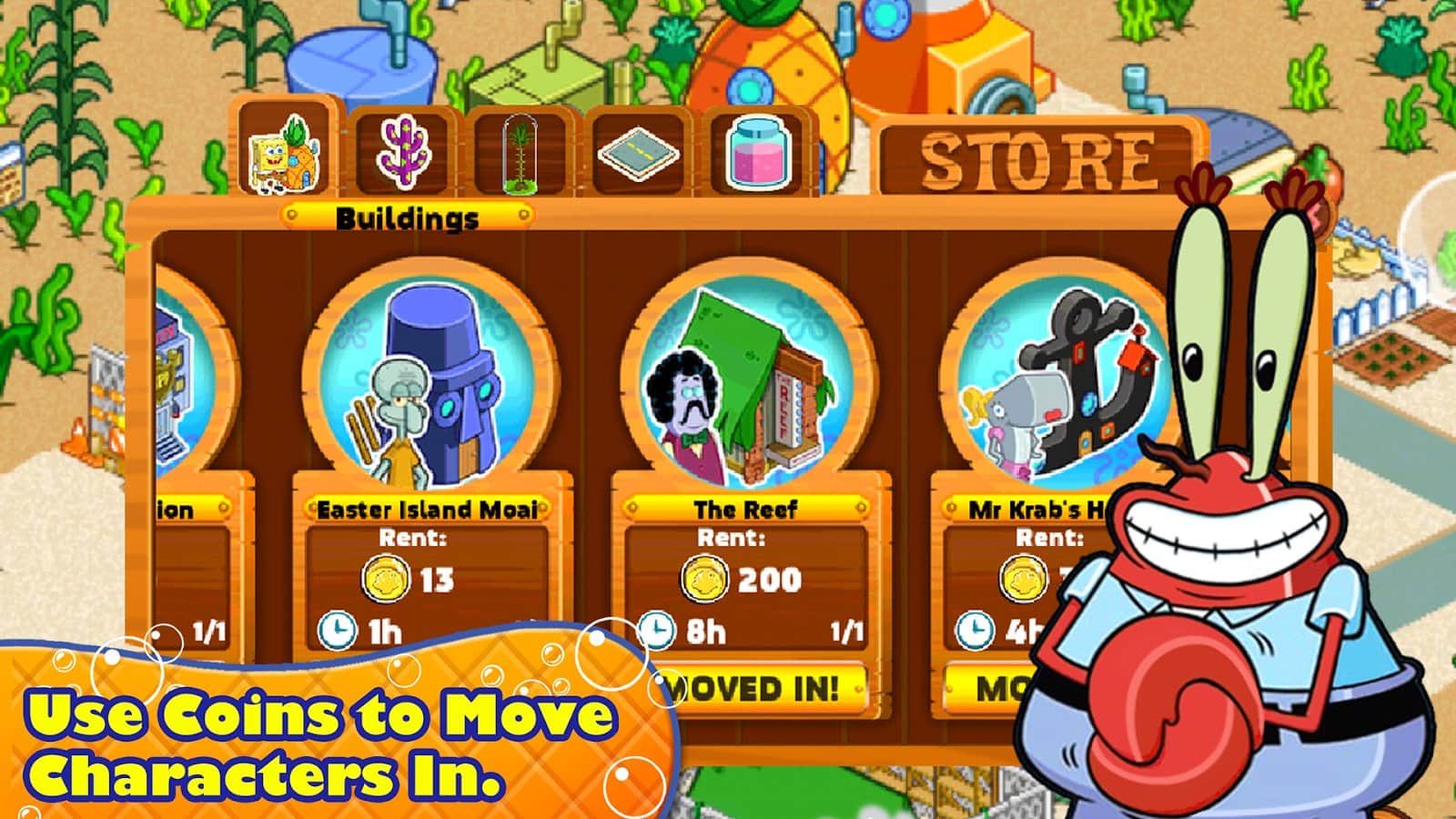Bob Esponja: mi Fondo de Bikini (SpongeBob Moves In) es una maravillosa estrategia en Android sobre el querido héroe del mundo submarino, a saber, Bob Esponja. Tu tarea es construir una verdadera ciudad submarina. Y te ayudarán con esto los personajes de la caricatura. El objetivo es alcanzar un cierto nivel de alegría. Cuando alcanzas la cantidad correcta, pasas al siguiente nivel. El juego tiene una moneda interna, recoge monedas, con ellas puedes construir edificios y comprar cada pequeño objeto.