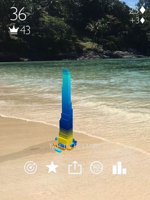 Stack AR - este juego puede parecer bastante aburrido, pero con la ayuda de las nuevas funciones de iOS, tienes que construir la torre no solo en el smartphone, sino directamente en cualquier superficie. La esencia del juego es bastante simple y banal, necesitas lanzar los bloques uno por uno y hacerlo de la manera más precisa posible, porque si tu torre comienza a inclinarse hacia un lado, eventualmente se caerá, y entonces estarás perdido.