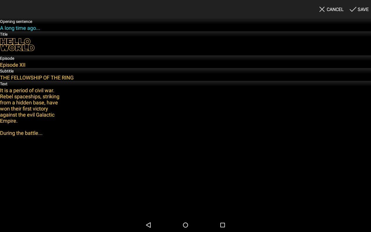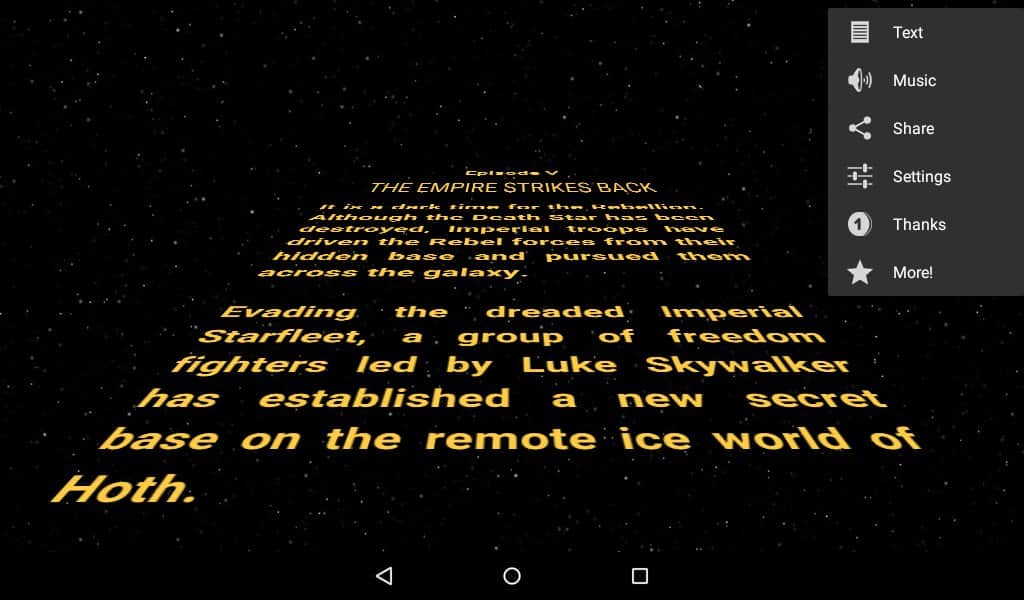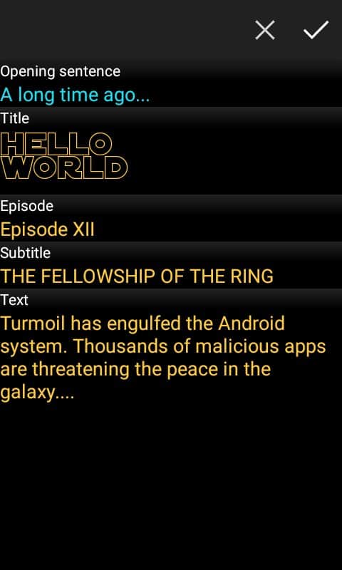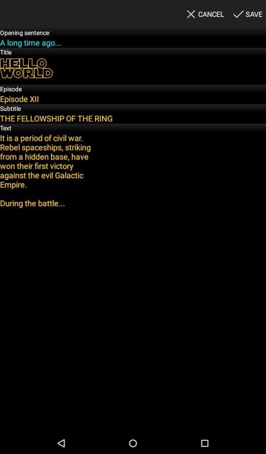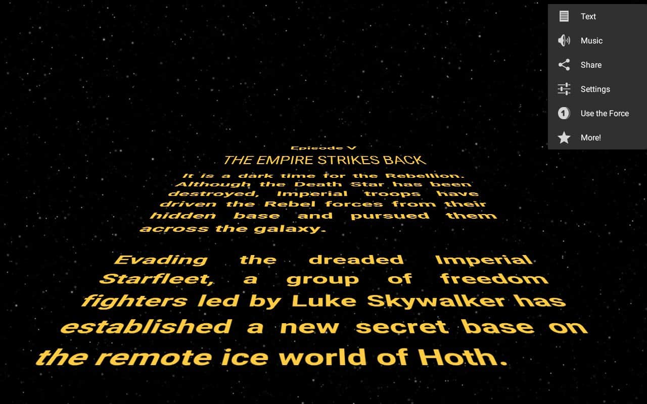 Palabras Estelares - Muchos de nosotros somos fanáticos de la serie Star Wars, y una parte única son los créditos, aquellos que navegan hacia las estrellas, y todo esto contra el telón de fondo del espacio. Ahora tienes la oportunidad de crear exactamente los mismos títulos, solo que en este caso puedes reemplazar el texto y algunos detalles. Esboza tu propio texto, establece la velocidad de desplazamiento, y luego en unos pocos cosani envía este clip a tus amigos en la red social, por supuesto, es muy simple y muy divertido.