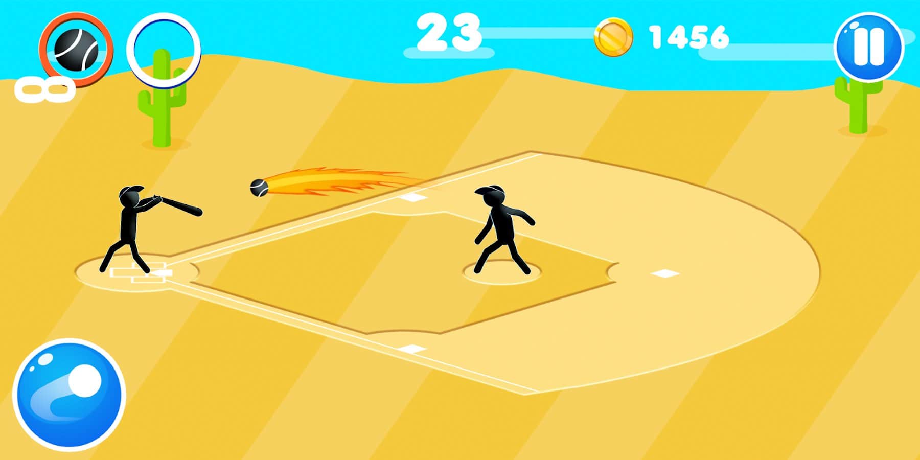 Béisbol de Hombre de Palo – el juego de deportes para Android donde jugarás béisbol. Toma el control de tu hombre de palo y golpea la bola con un bate, enviando la bola al vuelo, logrando excelentes resultados. Toca la pantalla en el momento adecuado y golpea con un bate tan fuerte como puedas, para que la bola vuele lo más lejos posible, estableciendo tu récord en este juego. Compite con otros jugadores y gana monedas, subiendo en la tabla de clasificación. Mejora tus bates, lo que te permitirá golpear la bola lo más posible y lograr excelentes resultados.