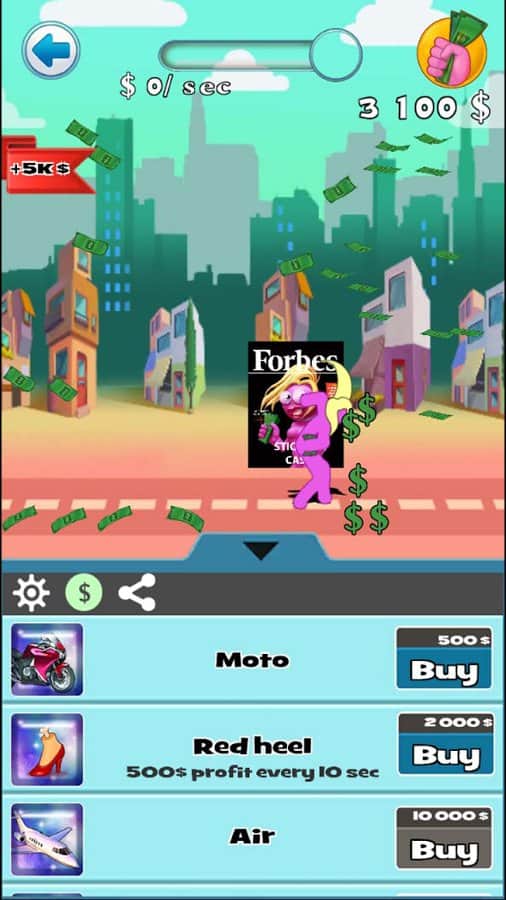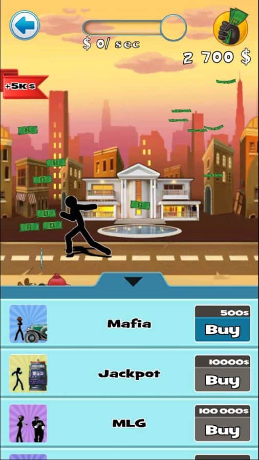 Stickman loco clicador de dinero en Android, donde ayudarás a un Stickman a convertirse en millonario. En este juego, tu tarea es hacer clic en la pantalla de tu dispositivo tantas veces como sea posible y dispersar billetes de dinero del Stickman. Con todo el dinero, tu personaje puede comprar varios bonos y mejoras como baile, técnicas de combate y armas. Dependerá de ti que tu héroe sea un millonario o permanezca pobre. Tu héroe puede convertirse en el jefe de la mafia, la estrella del espectáculo o un pícaro. El juego cuenta con varios modos y tramas, así como un nuevo personaje que es una chica. Juega este juego y alcanza resultados récord.