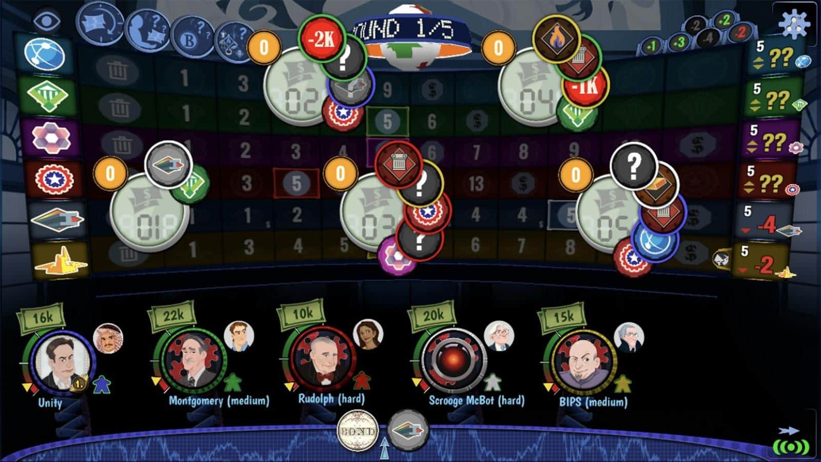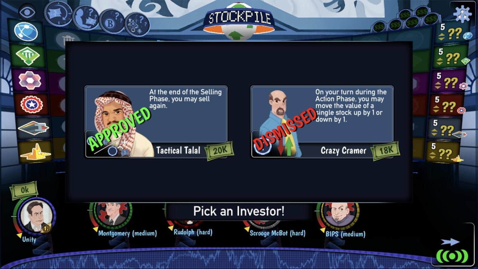 Stockpile – juego de mesa económico para Android donde comprarás y venderás acciones en el mercado de valores. En este juego estarás en el papel de un inversor de acciones cuyo trabajo es comprar acciones baratas y venderlas en el momento adecuado obteniendo un buen beneficio. Considera varios factores del mercado de valores y observa las compras de tus competidores, lo que puede interrumpir el plan perfecto. Considera todos los riesgos al comprar acciones e invierte tu dinero en la compra de diferentes acciones de numerosas empresas. El ganador del juego será el jugador que al final del juego tenga una mayor cantidad de dinero.