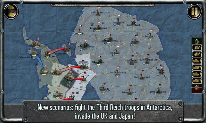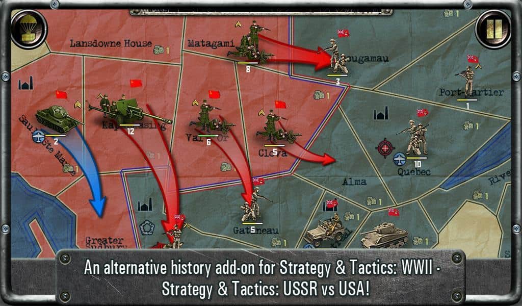 Strategy & Tactics: URSS vs EE. UU. - una estrategia para Android, en la que los eventos tras la Segunda Guerra Mundial fueron completamente diferentes. La URSS lucha contra los EE. UU., las batallas tienen lugar en Alaska, México, Canadá e incluso hay misiones para destruir los restos del ejército de Hitler en el Polo Sur.