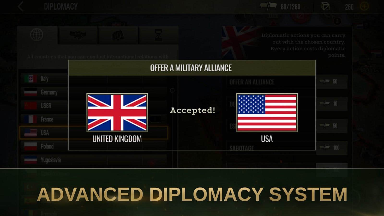 Estrategia y Tácticas 2: WWII - Echa un vistazo a la Segunda Guerra Mundial desde un ángulo diferente, ¡gestionando uno de los países! Cada escenario será completamente diferente entre sí, ya que en cada uno de ellos hay cientos de misiones históricas que cambian significativamente el desarrollo de la trama. Explora la diplomacia política desde el principio de la historia, estudia a cada líder con el que tendrás que llevar a cabo importantes negocios, así como mejorar constantemente tus propias posesiones en forma de equipo, el número de militares y unidades ensambladas para sus tareas únicas.