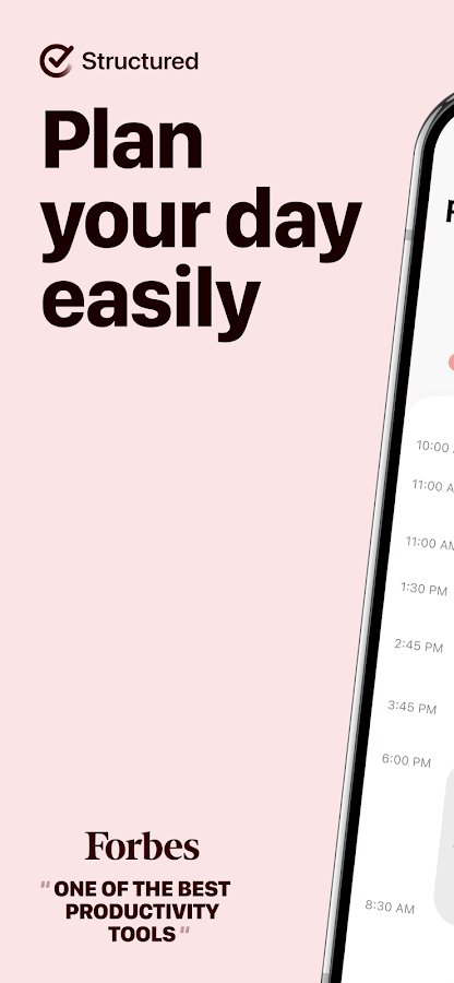 Structured - Planificador Diario - es tu planificador inteligente que combina calendario, lista de tareas y rastreador de hábitos en una única línea de tiempo visual, para que puedas organizar tu día de la manera más eficiente posible. En la aplicación, todas las reuniones, tareas y eventos personales se muestran visualmente en un solo lugar: en una línea de tiempo intuitiva. Agrega y edita tareas en segundos, cambia plazos y adapta tu día a tus necesidades.