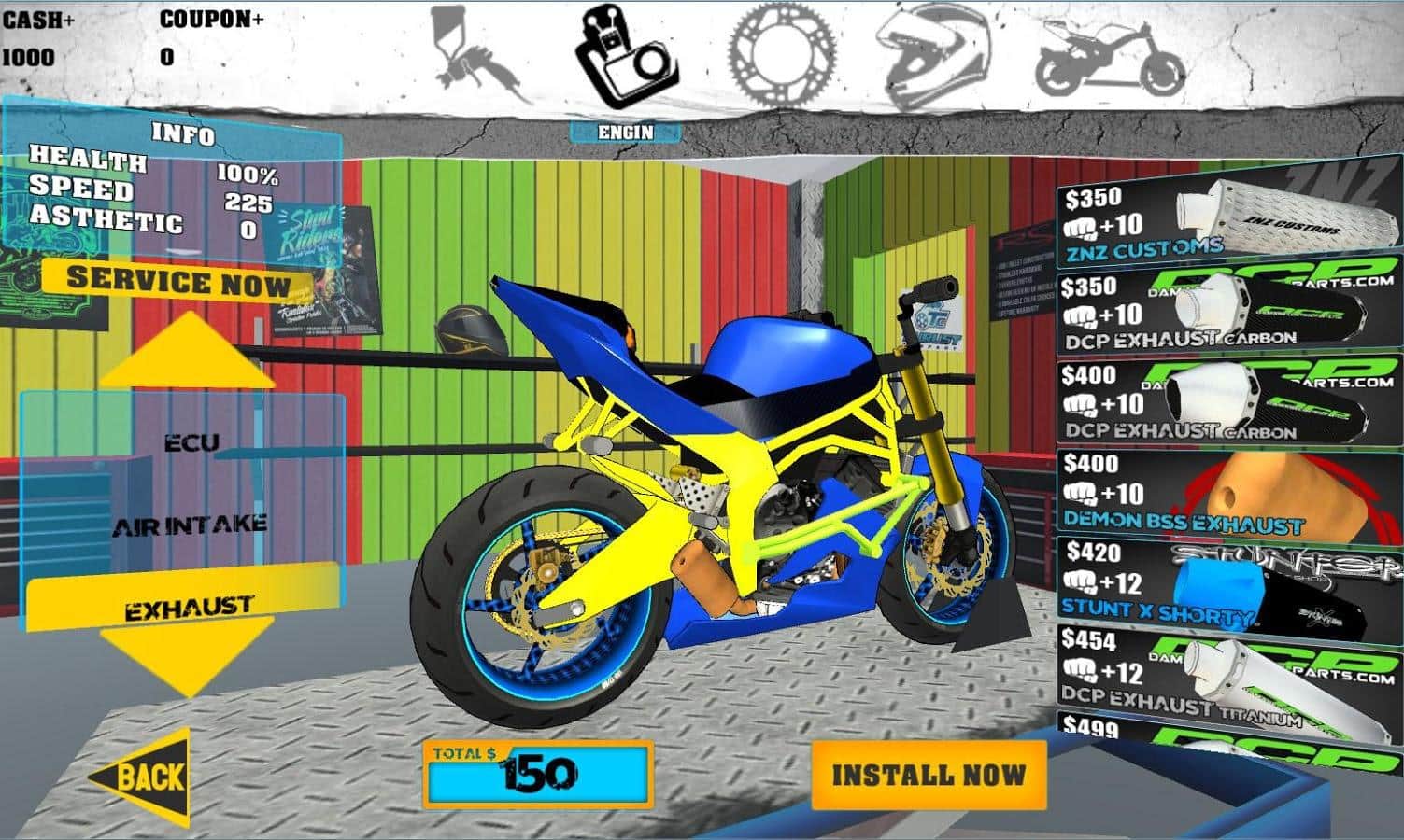 En una motocicleta no solo puedes volar en línea recta, sino también hacer trucos locos en la carretera Stunt bike freestyle. Ponte al volante de una poderosa moto y aprende los increíbles trucos, creando tu propia técnica combinando múltiples trucos estándar. Cuida especialmente la actualización oportuna de la motocicleta y su exhaustiva revisión bajo los requisitos actuales, lo que se facilitará con cientos de piezas. Compra la mejor moto, ajusta su apariencia más allá del reconocimiento y muestra el truco vertiginoso!