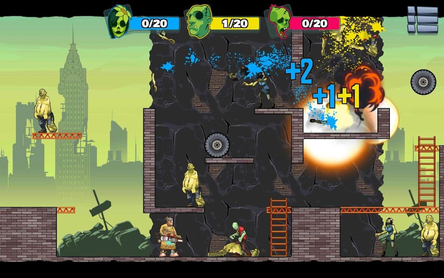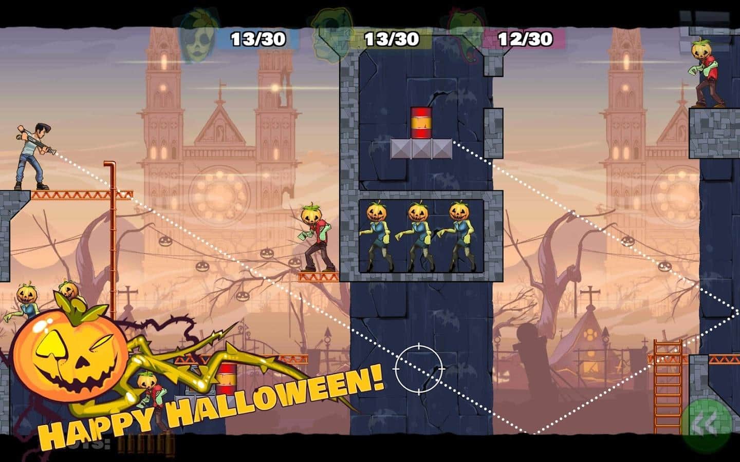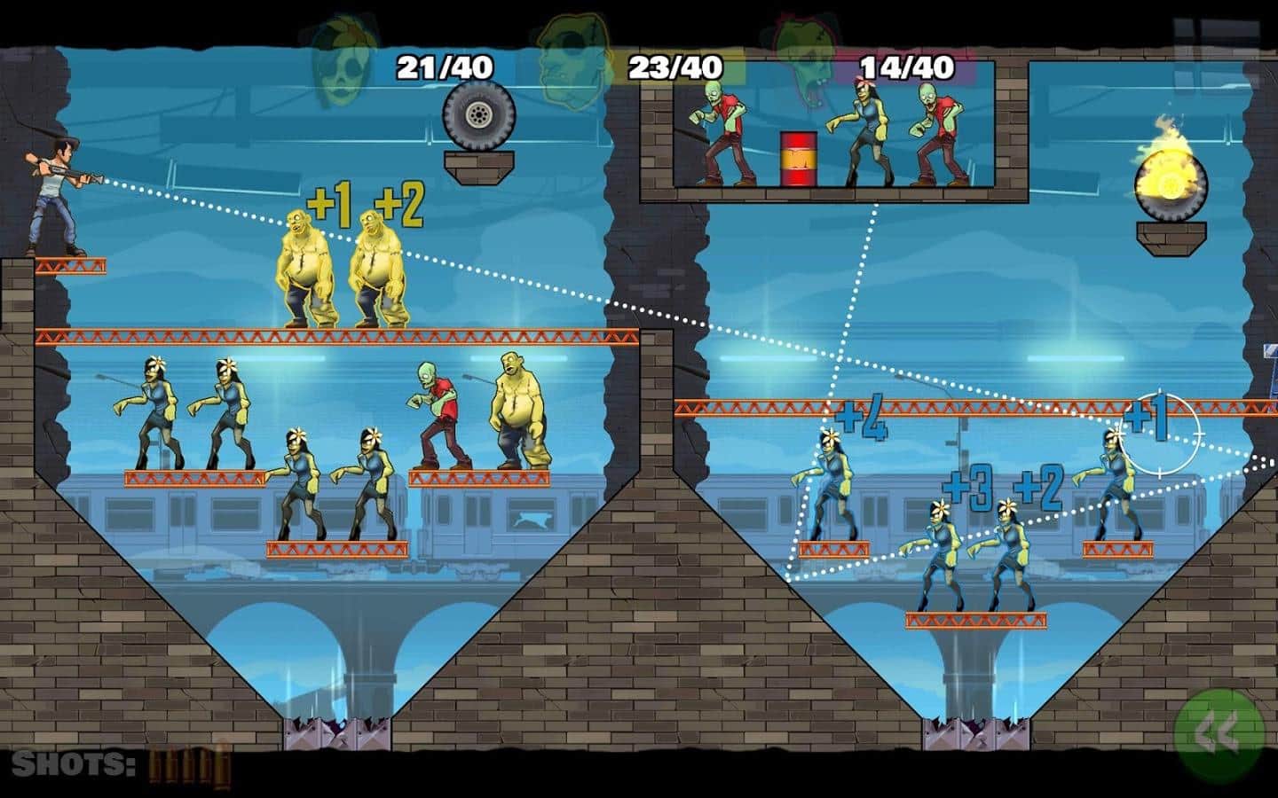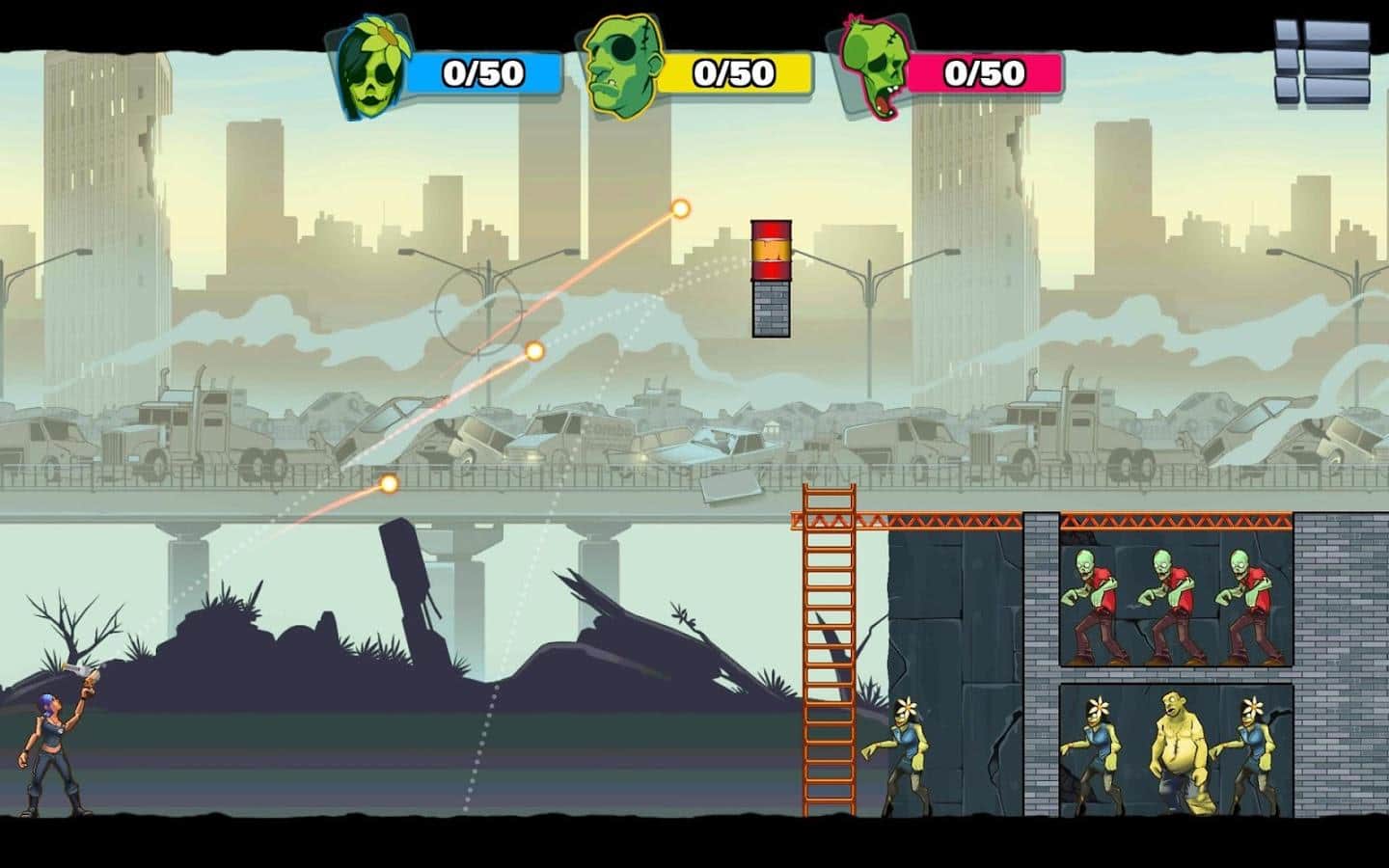 Dying Light - un conocido proyecto de zombis con plataformas de juegos de mesa y consolas. Sin embargo, a nuestro juego de hoy, esta criatura está solo lejanamente relacionada, después de todo, se trata de zombis, y lo que motivó a los desarrolladores de Stupid Zombies 3 - Dying Light al usar un nombre popular no está del todo claro. Pero ahora no se trata de eso. Stupid Zombies 3 - Dying Light es un juego de rompecabezas arcade sobre el Apocalipsis zombi en comparación con las entregas anteriores, el juego ha sufrido varios cambios. La tercera parte es un juego con elementos de física, en cada nivel, de los cuales en este juego, tienes que destruir a todos los devoradores de cerebros, mientras usas menos munición. Y se puede hacer utilizando literalmente todo lo que hay en la ubicación: barriles, cajas, bloques. No te olvides de los rebotes.