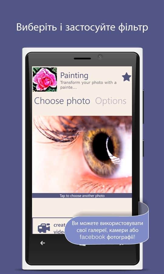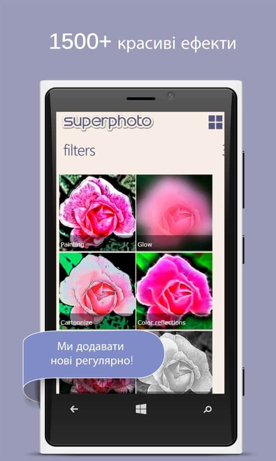 SuperPhoto para Windows Phone 7.5. Crea fotos impresionantes con el uso de un gran número de filtros y efectos. También existe la posibilidad de usar la aplicación SuperPhoto en fotos existentes en la galería de tu dispositivo. ¡Buen ánimo y exitosos experimentos!