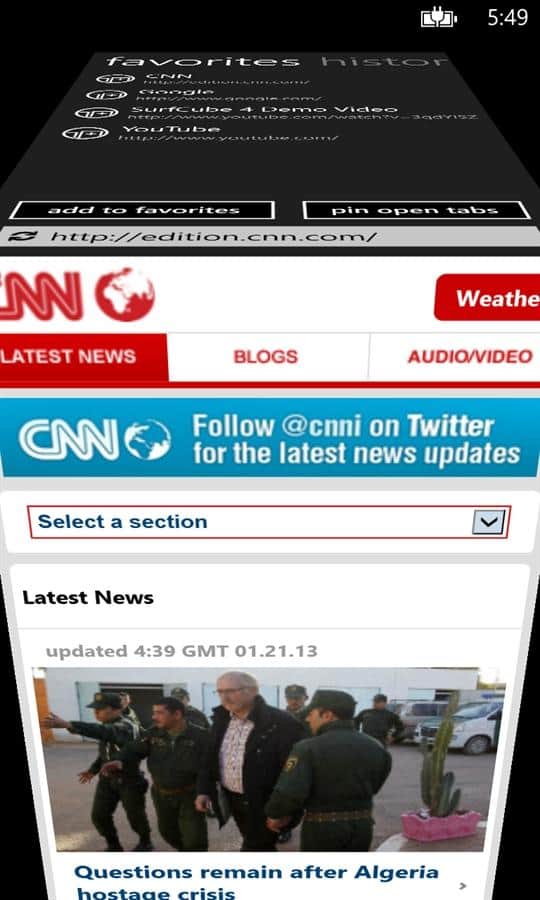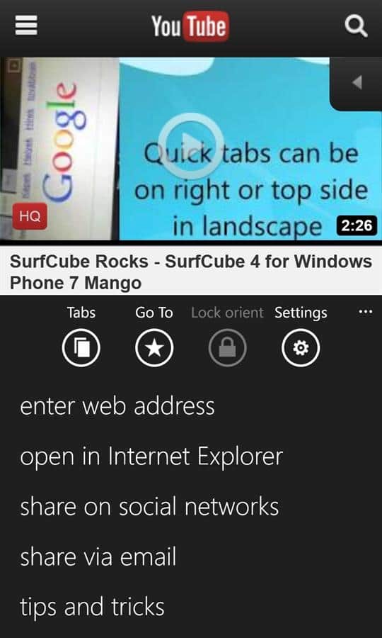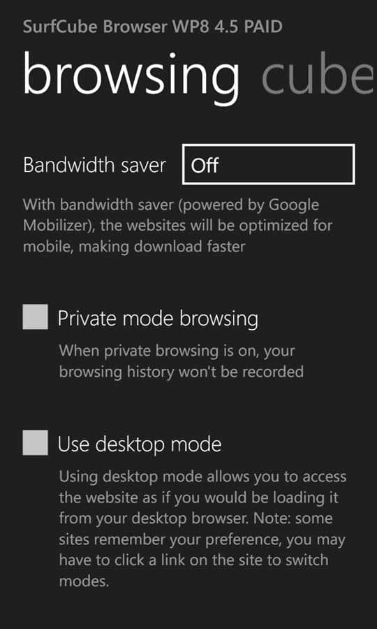 SurfCube 3D Browser es el navegador web más popular y completo para teléfonos con Windows. Es muy fácil de usar porque toda la interfaz está representada en forma de un cubo de 5 lados. Este motor de búsqueda, marcadores, configuraciones e historial, todo esto puede ser necesario en cualquier momento. Ahora se ha vuelto mucho más fácil usar Internet para ver tus sitios favoritos.