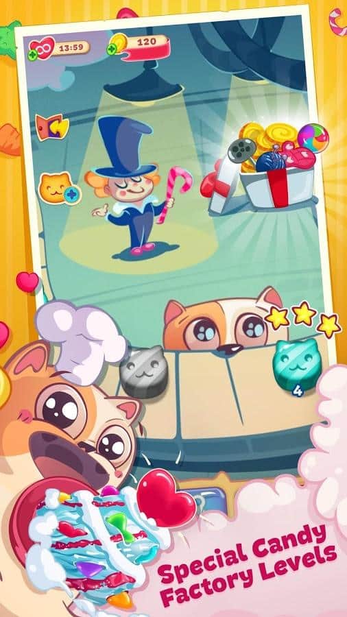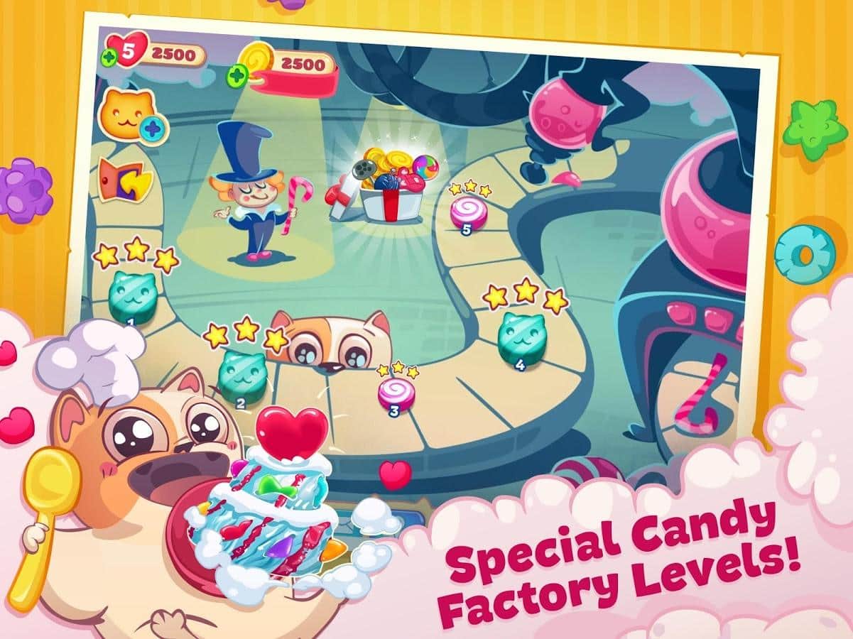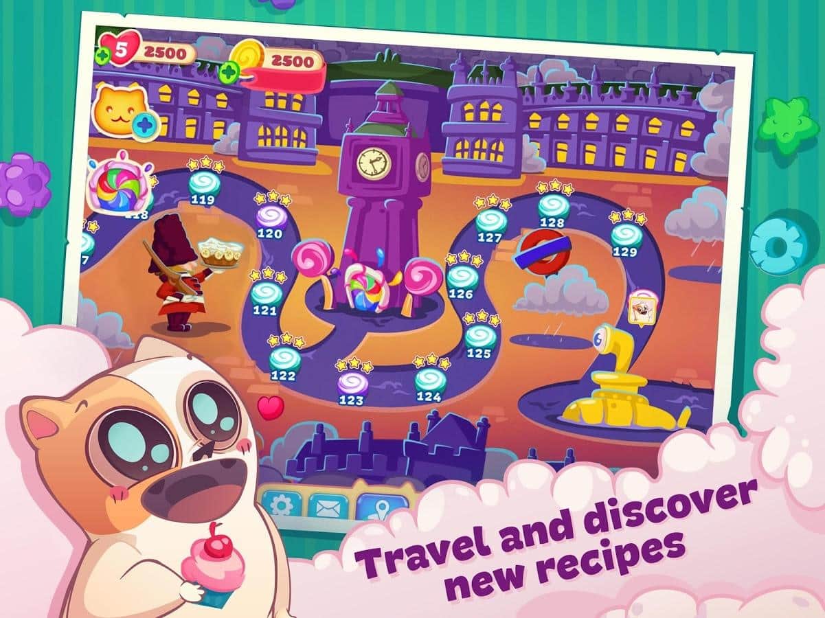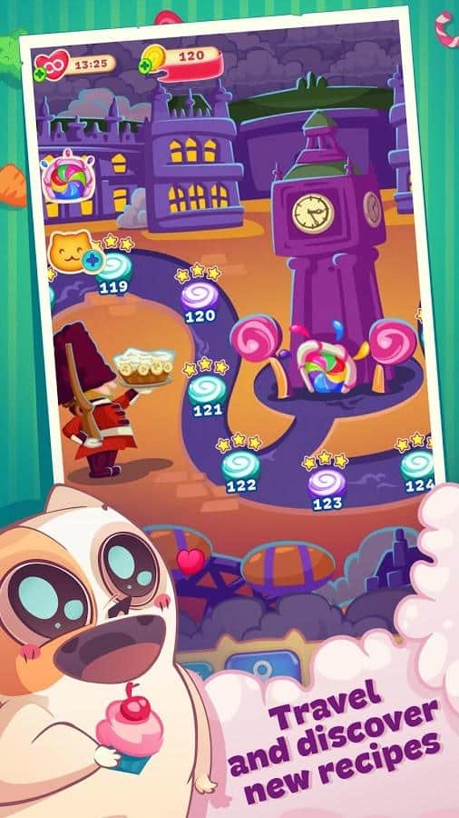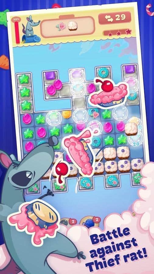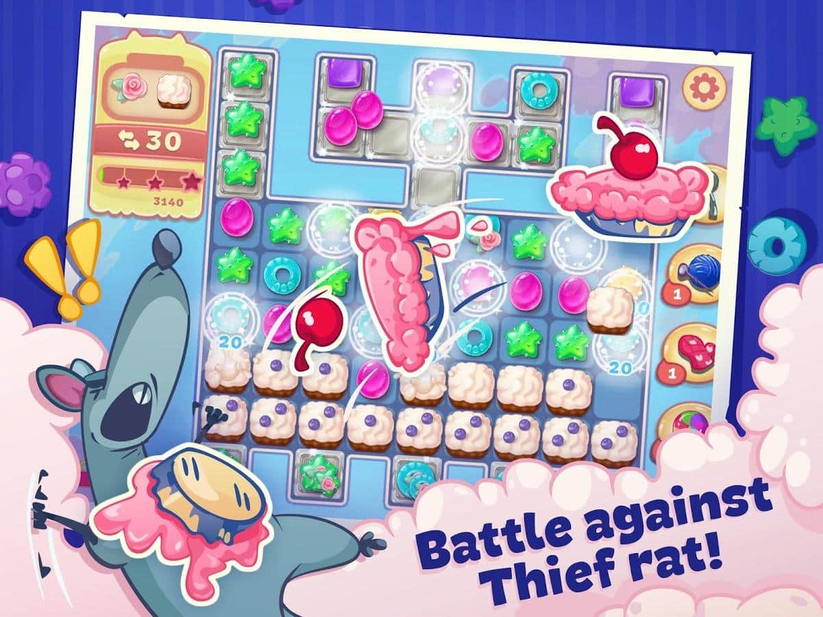 Gatito Dulce – el juego de tres en raya en Android donde ayudarás a su querido gatito a convertirse en el mejor chef. Nuestro héroe viaja por el mundo y recoge diferentes recetas en su libro de cocina, pero en su camino se encuentran las traicioneras ratas, que le impiden convertirse en el mejor chef. Haz largas filas de una variedad de dulces y conecta toda tu lógica e ingenio para pasar fácilmente todos los niveles del juego. Usa varios bonificaciones y potenciadores lo más rápido posible y pasa todos los niveles. Derrota a las insidiosas ratas y no dejes que arruinen tus planes. El juego te deleitará con numerosos y variados niveles deliciosos.