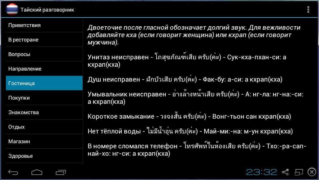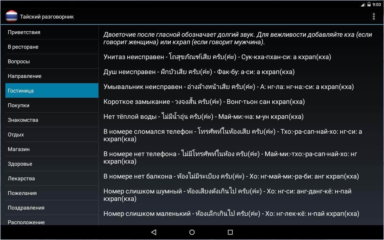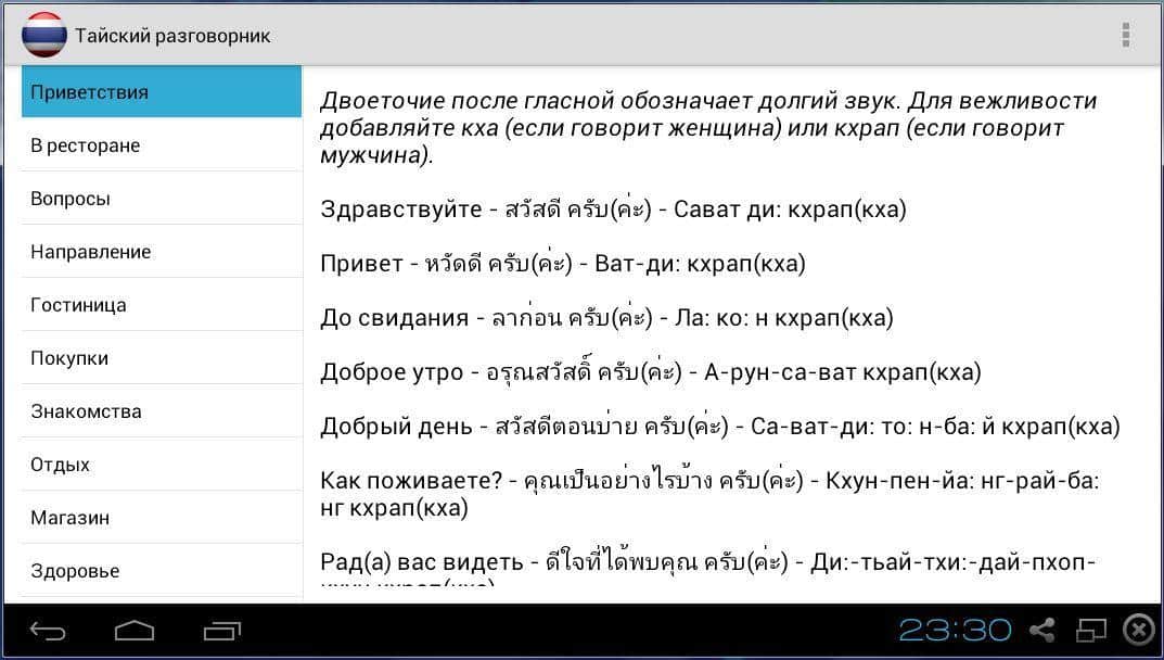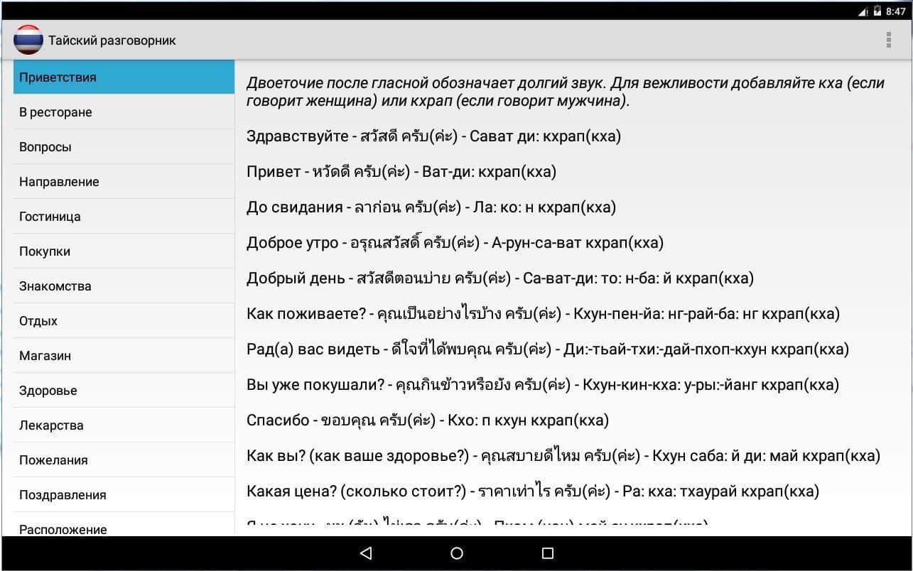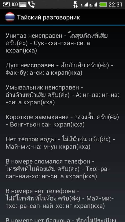 Guía de frases tailandesa – le ofrecemos a su atención una guía de frases tailandesa del desarrollador eugene_za, que será indispensable en el viaje turístico, para comunicarse con los residentes de la increíble Tailandia. La guía de frases está dividida en categorías, que contienen una serie de frases y oraciones escritas en el idioma tailandés, y su pronunciación en el idioma ruso.