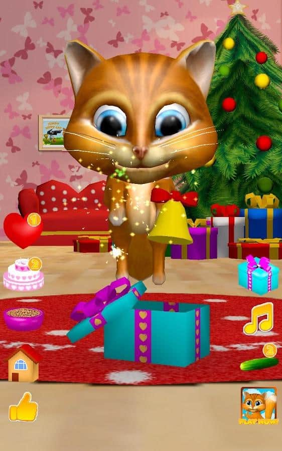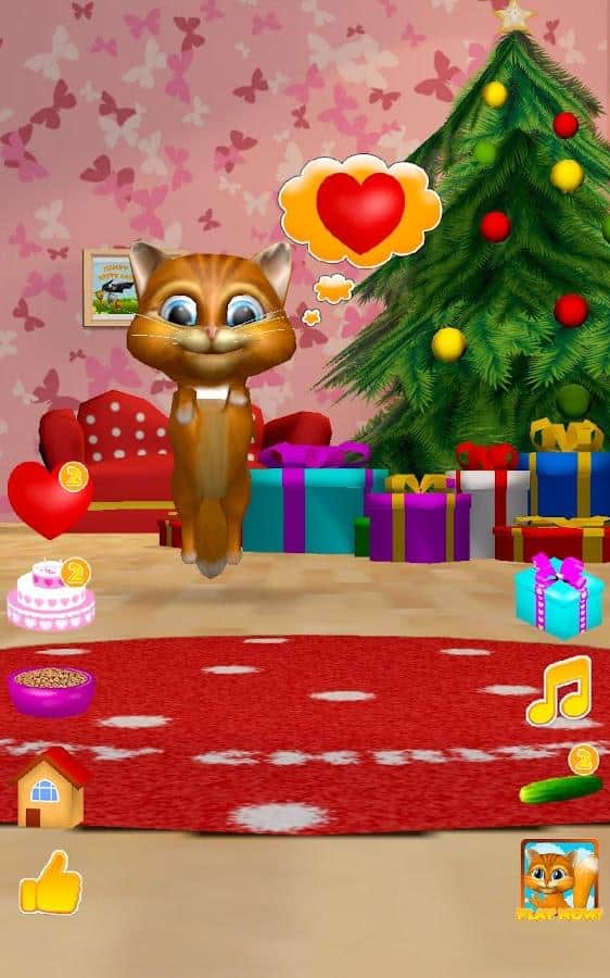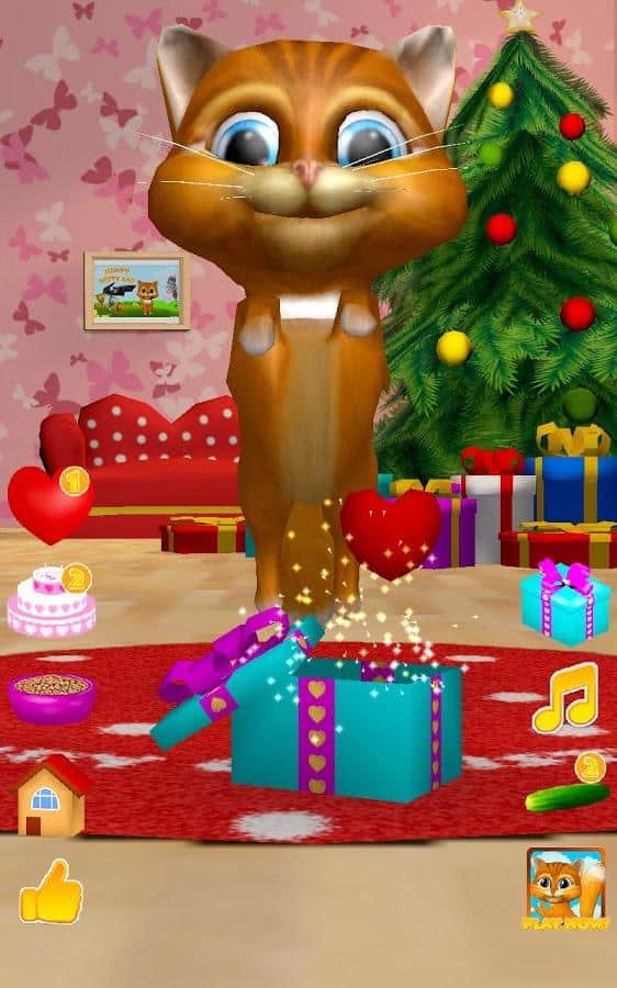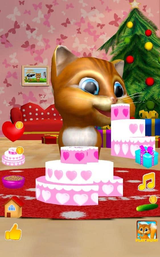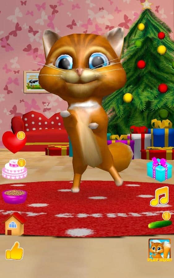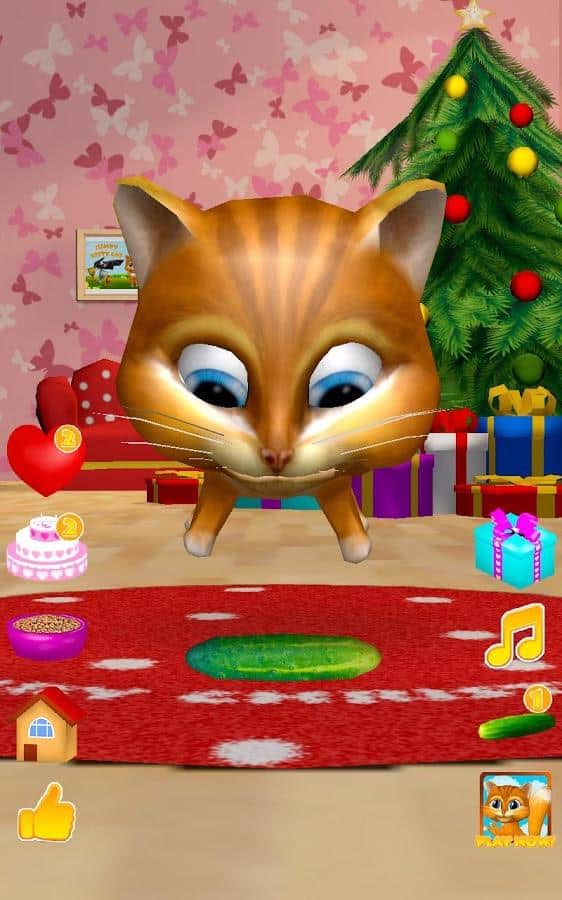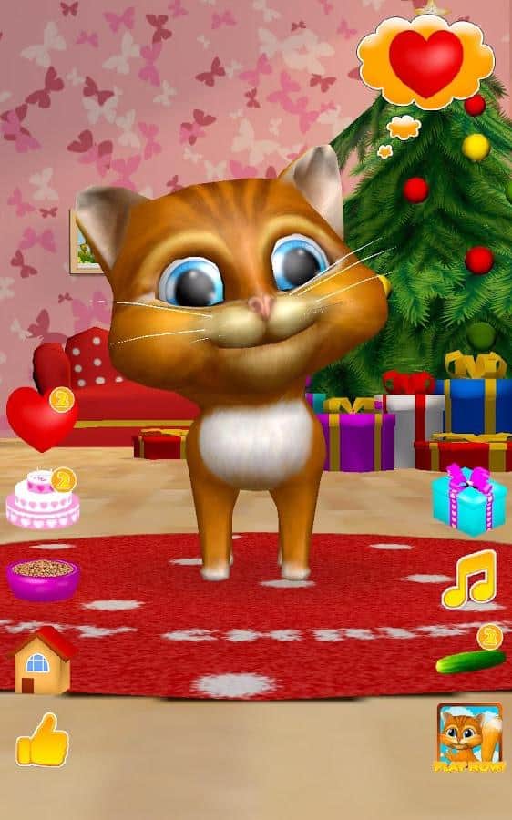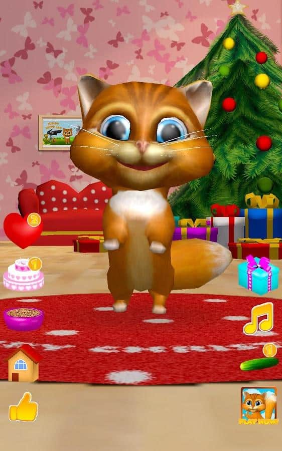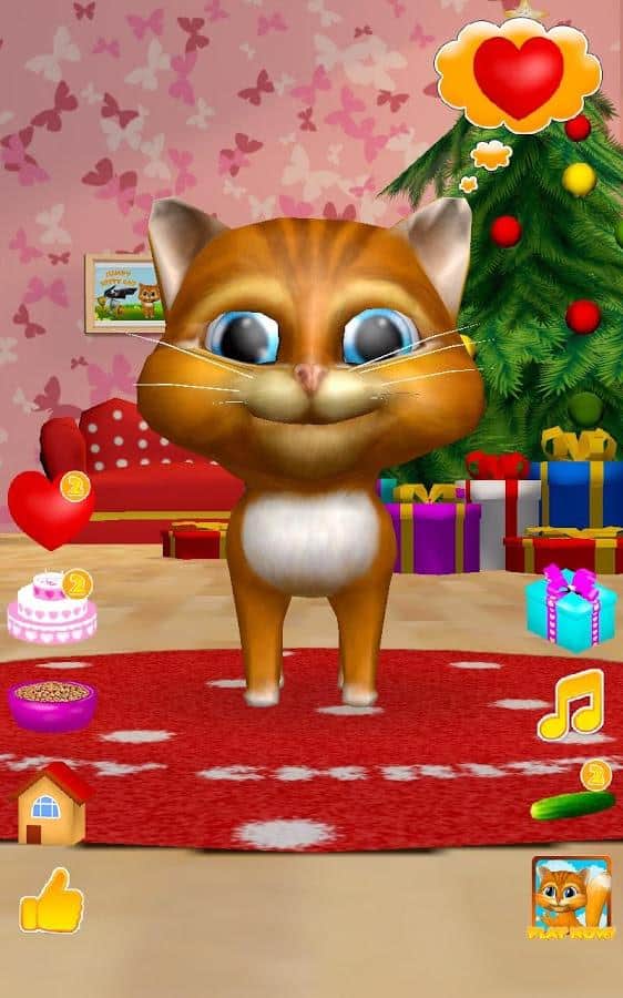Gata Habladora Diana 3D – un juego en Android donde puedes tener una gata habladora en tu teléfono o tableta. Si te gustan los juegos de este género o simplemente quieres complacer a tu hijo con una nueva mascota habladora, entonces este juego es para ti. En este juego podrás observar a la gata que repite tus palabras con su voz divertida, verla bailar, acariciarla y alimentarla con un delicioso pastel. Acaricia a la gata Diana tocando con un dedo su nariz y ella te escuchará y ronroneará. Dale corazones a tu gata y observa cómo se regocija. No olvides alimentarla y darle tiempo para descansar.