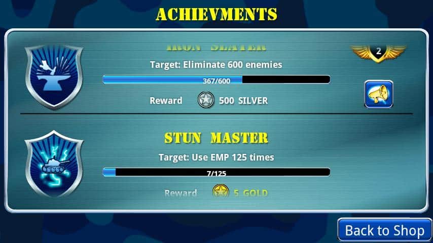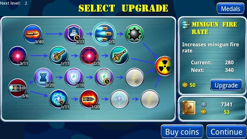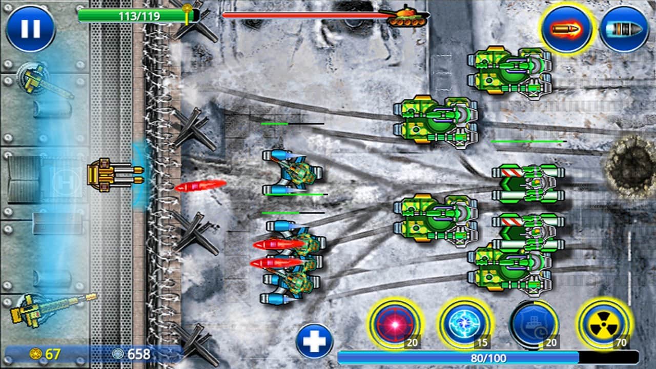 Por cada unidad destruida recibirás monedas de plata, y por completar misiones y misiones adicionales – oro. Después de pasar un nivel, puedes gastar en la modernización de armas y mejorar la protección de la base.