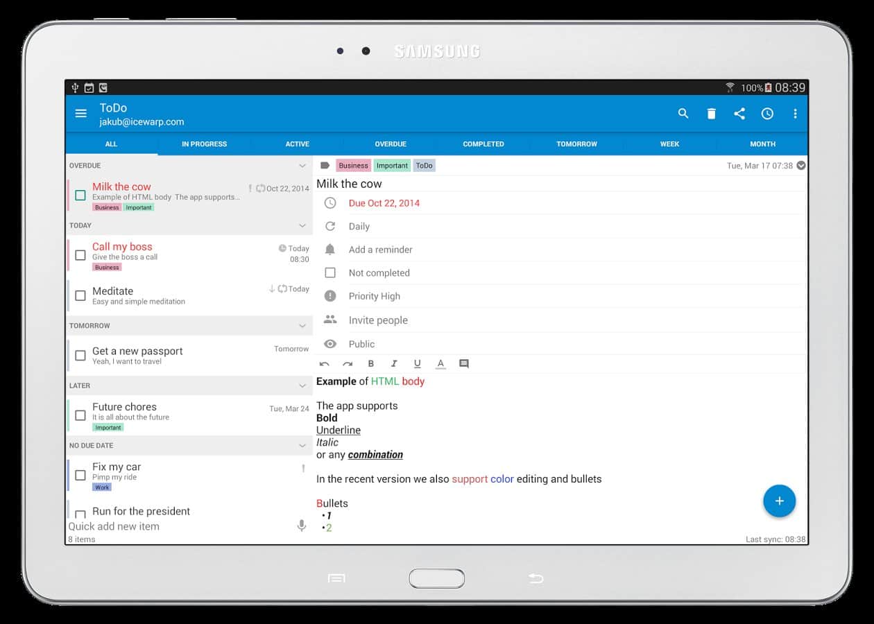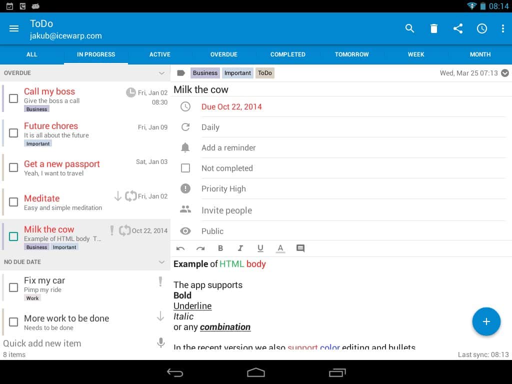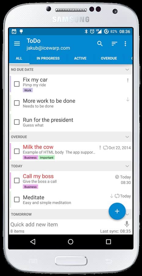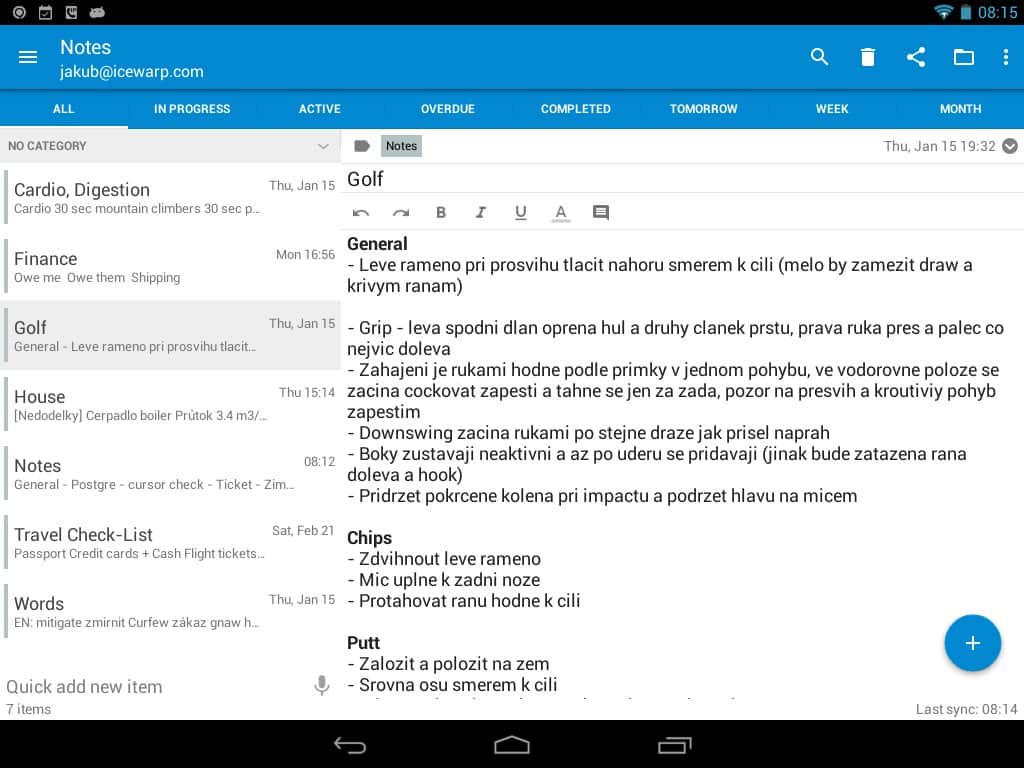 Tareas y Notas para MS Exchange – un gran programa gratuito para smartphone/tableta Android del desarrollador Jakub Klos, que complementa exitosamente el calendario estándar, tareas y notas. Soporta sincronización con MS Exchange, incluyendo cuentas en Hotmail/Outlook.com (y Outlook de escritorio 2013, respectivamente).