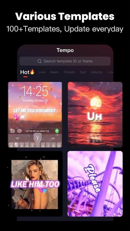 Tempo - Editor de Video con música - Elige una plantilla en la que quieras editar videos a tu manera. Tienes la oportunidad de definir una categoría y ver qué opciones hay: amor, letras, emoticonos, caricaturas, etc. Añade música de acompañamiento al video, recopila fotos para los videos, aplica efectos especiales interesantes y realiza transiciones inusuales. Cada video puede hacerse único con la ayuda de imágenes subidas, textos, fuentes, animaciones y otros datos. Al final, puedes compartir fácilmente el resultado en las redes sociales.