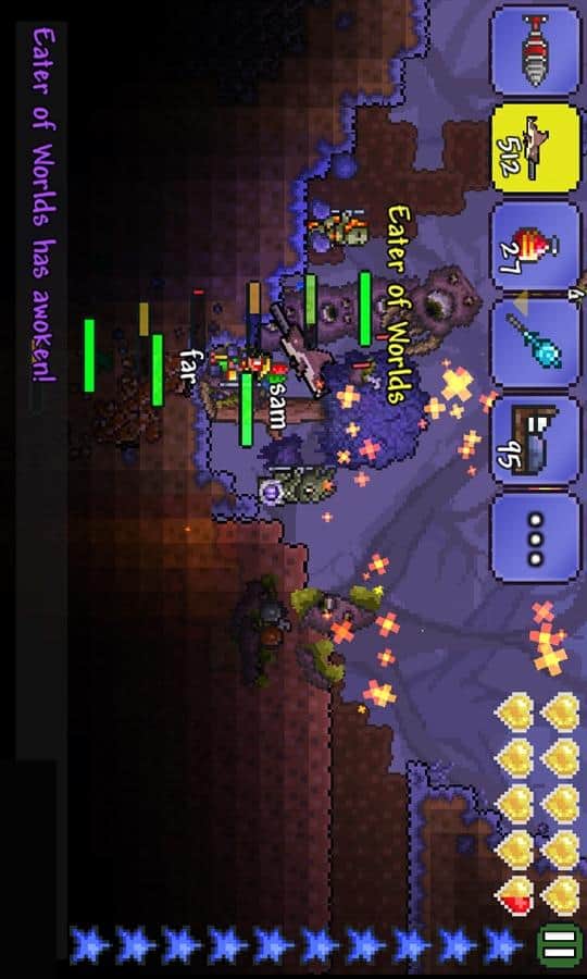 Terraria - un juego adictivo, donde visitarás un mundo increíble y tendrás que luchar contra malvados jefes. Este mundo es como un lienzo donde puedes crear lo que quieras, visitar las islas flotantes en el cielo, construir tus casas allí, buscar nuevas armas y mejorar tu personaje dándole diferentes habilidades. Comienza tu aventura ahora y lucha contra terribles monstruos en un juego que tiene más de 80. Usa bloques y otros materiales de construcción, que en el juego abundan, y viaja por los vastos mundos abiertos.