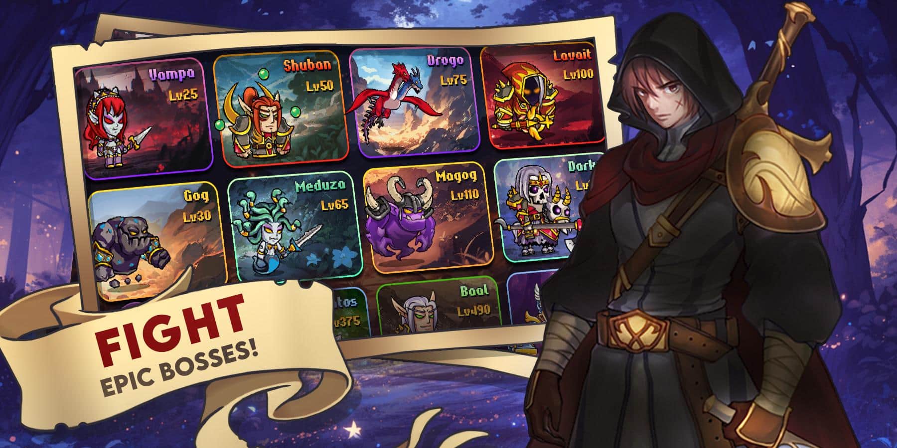 El RPG Oscuro: Juego de Pixel 2D - una aventura de rol de fantasía que te transporta a la atmósfera de los clásicos juegos de 8 bits. Prepárate para mazmorras, batallas, un mundo abierto y numerosas oportunidades para mejorar a tu héroe. Gestiona personajes, mejora sus habilidades y conquista dinámicos mini-juegos del género auto-clicker. Elige entre cuatro clases de héroes únicas, incluyendo un mago, un caballero e incluso un gato peludo, para encontrar tu estilo de juego perfecto. Descubre los misterios del pueblo de Tranquilo y cierra las puertas al mundo de los demonios!