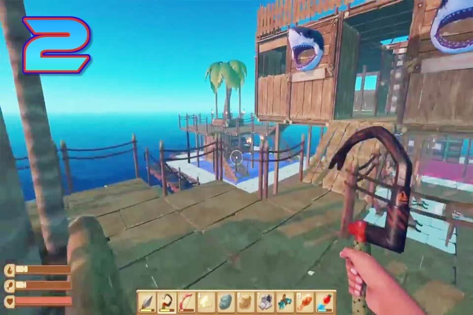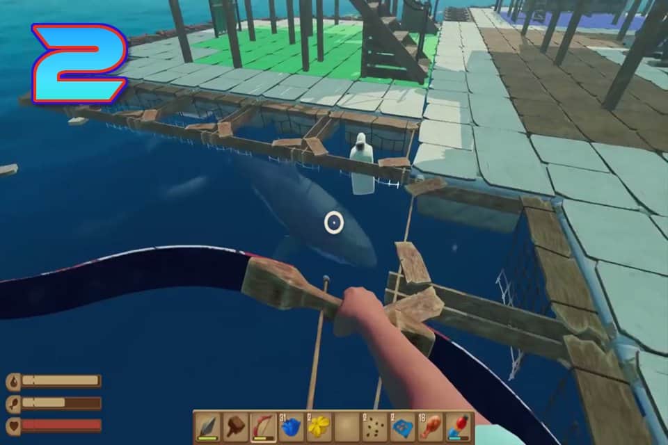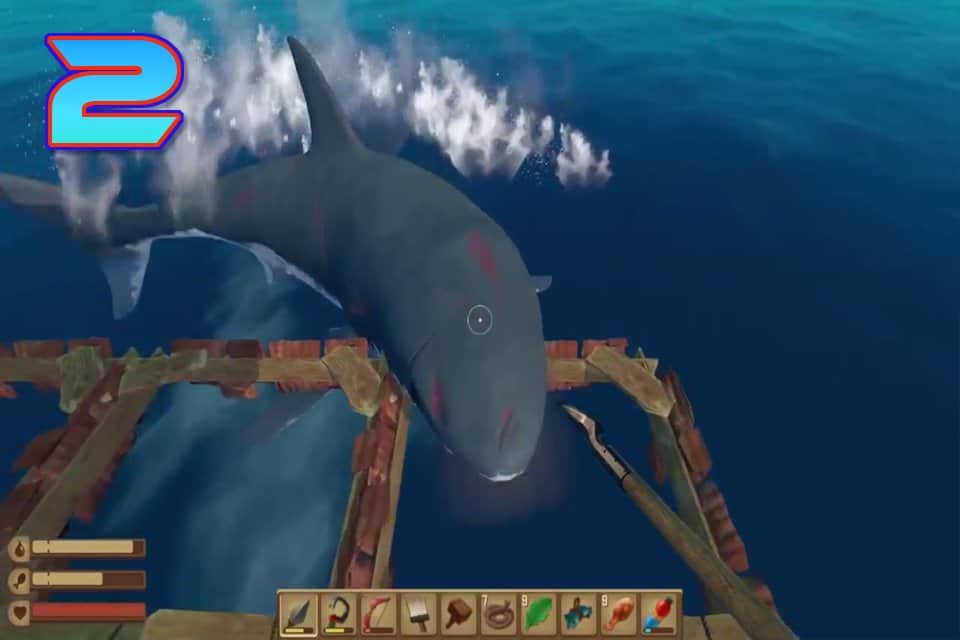 El juego de aventura RAFT 2 - Supervivencia en el mar donde sobrevivirás en condiciones extremas. En este juego te encontrarás en medio del océano solo en una pequeña balsa, tu barco se hundió y eres el único sobreviviente del naufragio. Tu tarea principal será sobrevivir y recoger tantos recursos útiles como objetos para ampliar la balsa. Explora el océano y descubre las numerosas islas, completando varias misiones y tareas. Sé extremadamente cauteloso y cuidadoso para no caer en las garras de un enorme tiburón que te acechará a lo largo del camino. Usa el gancho para sacar del agua hojas, barriles, troncos y otros objetos necesarios para la construcción de la balsa.
