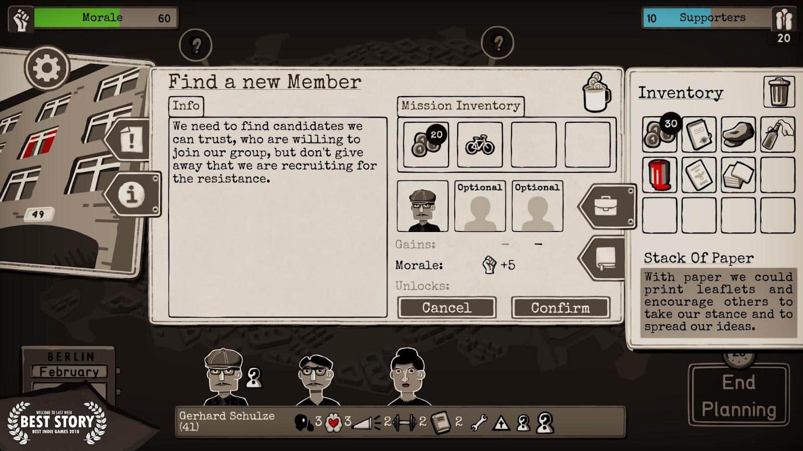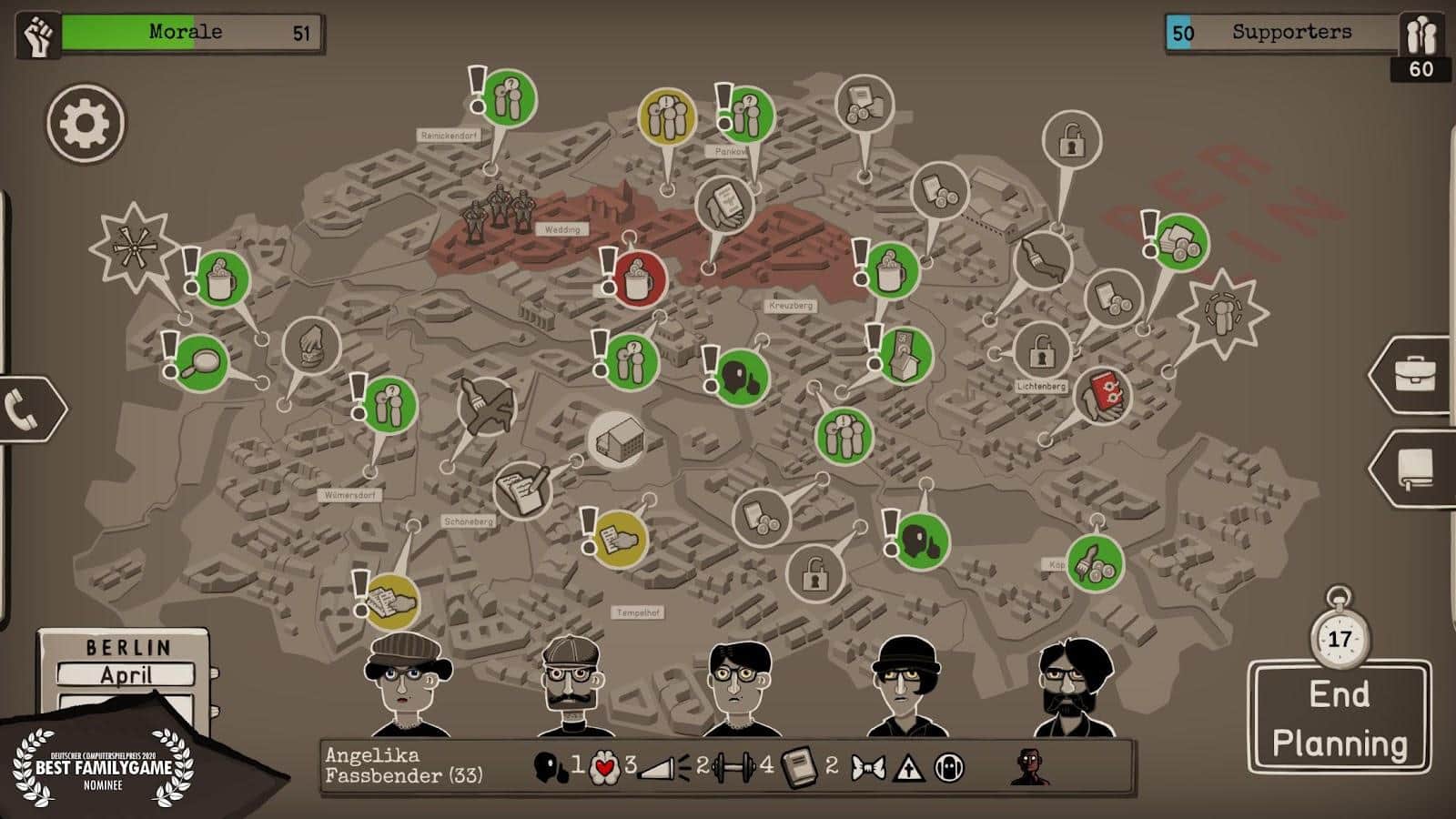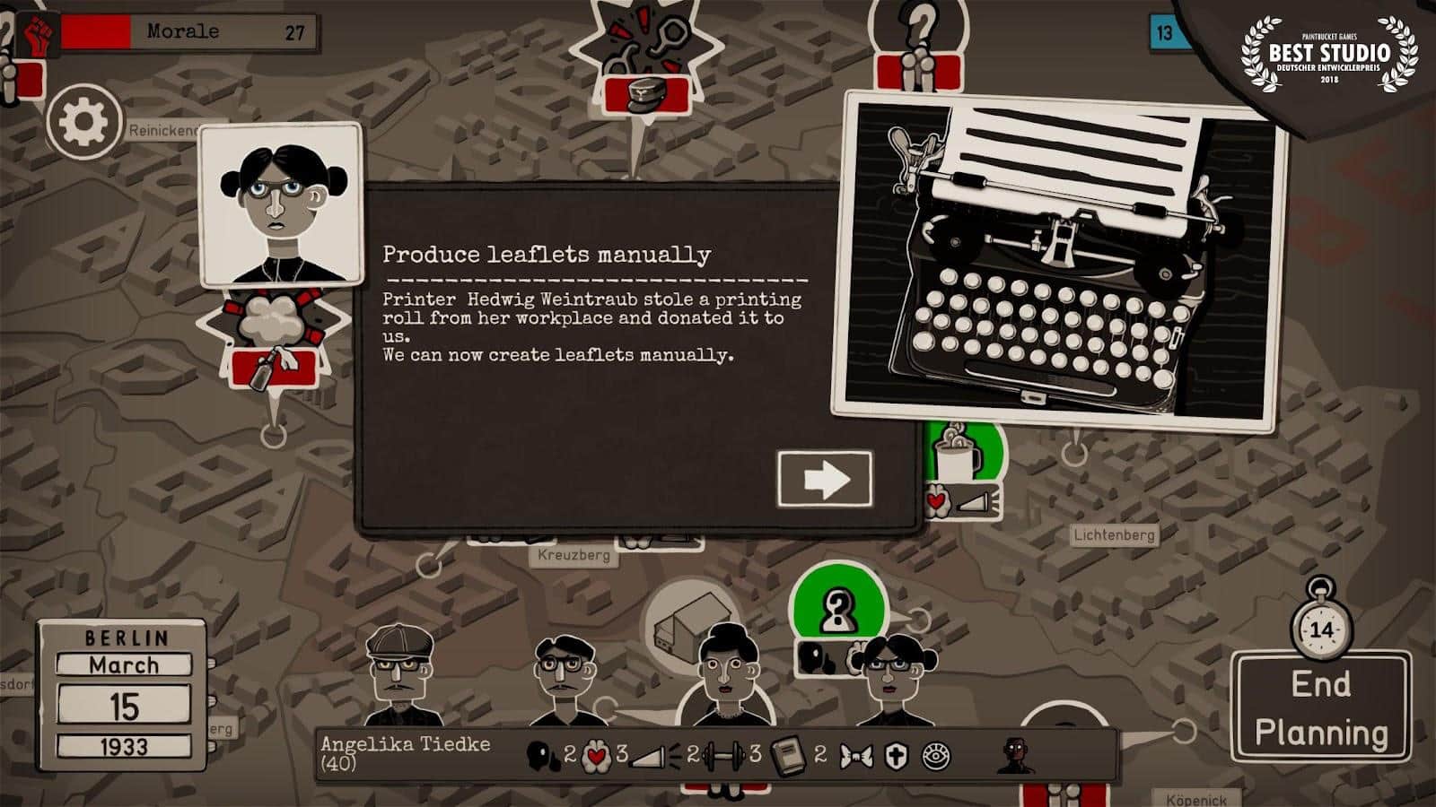 A través de los momentos más oscuros — un juego del género de estrategia histórica en Android, que está dedicado al movimiento de resistencia en el período más oscuro de la historia y a la vida cotidiana de las personas comunes del Tercer Reich. La precisión histórica significa que tu pequeño grupo no cambiará el resultado de la guerra — y no podrá prevenir todas las atrocidades nazis. Sin embargo, podrás hacer todo lo posible para salvar tantas vidas como sea posible y resistir al sistema en cada oportunidad. 1933, Berlín. Eres el líder de un pequeño grupo de resistencia, que incluye a personas comunes — los judíos y los católicos, los comunistas y los patriotas, que no pueden mirar hacia otro lado. Tu tarea es poner en modo pequeños baches para dispersar volantes y contar a la gente lo que los nazis están haciendo en realidad; escribir mensajes en las paredes; sabotear; obtener información y reclutar nuevos asociados. Y no finjas: si el régimen se entera de tu grupo, la vida de cada participante estará en peligro.