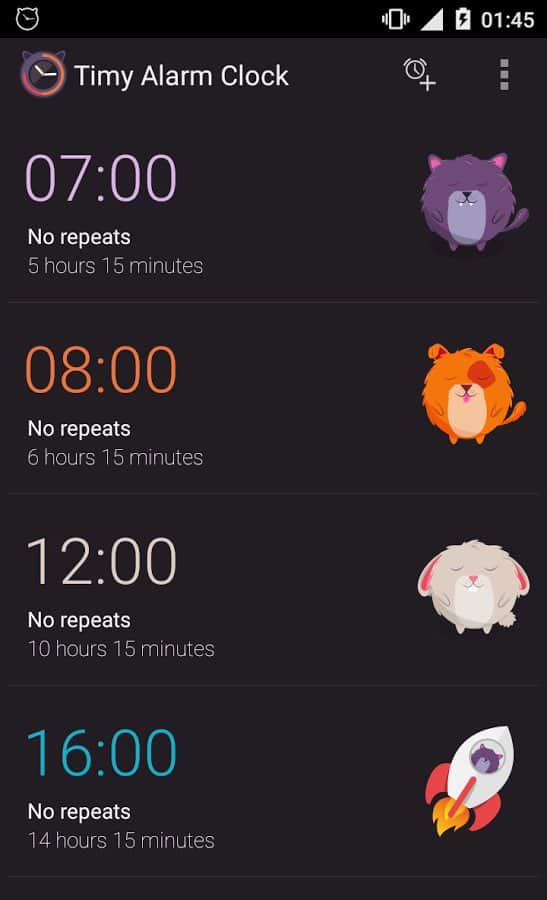 Reloj Despertador Timy – a veces es bastante imposible despertarse temprano por la mañana, a pesar del persistente sonido del despertador que ya has reordenado más de una vez, sin siquiera abrir los ojos. Te ofrecemos un reloj despertador inusual que no solo te entretendrá con su interfaz, sino que también te ayudará a finalmente despertarte, y ese es su propósito. El Reloj Despertador Timy contiene varios personajes como el perro, el conejo y el gato, así como tres niveles de dificultad que debes completar para terminar de despertar. Hay una opción de una composición favorita, para establecer como tono de alarma de audio y control de volumen.