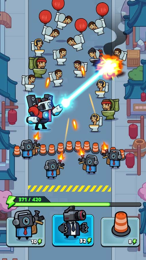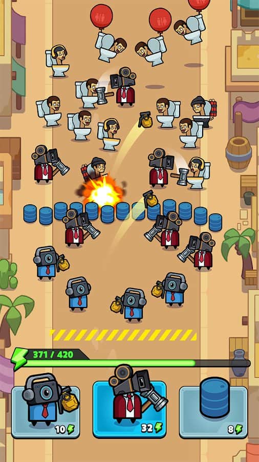 Lucha en el inodoro: Policía vs Zombi - Bienvenido al mundo post-apocalíptico, donde los zombis no son solo los muertos vivientes, ¡sino también monstruos del inodoro! En el juego te encontrarás en una ciudad post-apocalíptica donde la mayoría de las personas se han convertido en zombis justo durante sus actividades diarias en el inodoro. Sé un asistente de los oficiales superiores que están detrás de las cámaras y ayúdalos a sobrevivir defendiendo de interminables oleadas de enemigos. Crea barreras defensivas, mejora tu equipo y utiliza diversas estrategias para resistir el mayor tiempo posible.