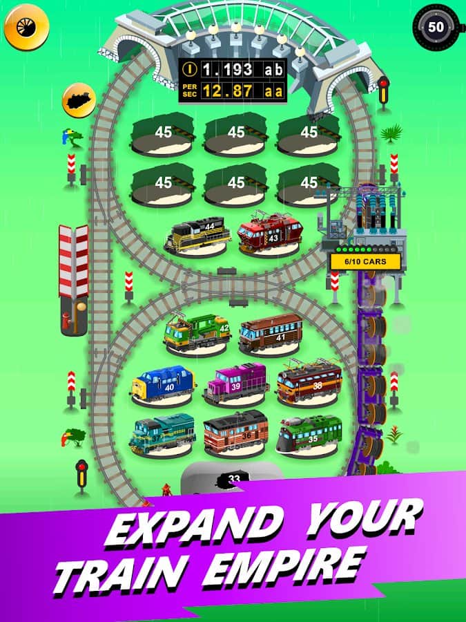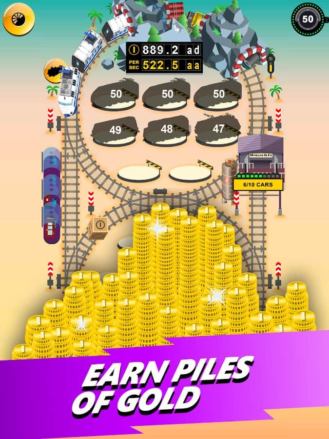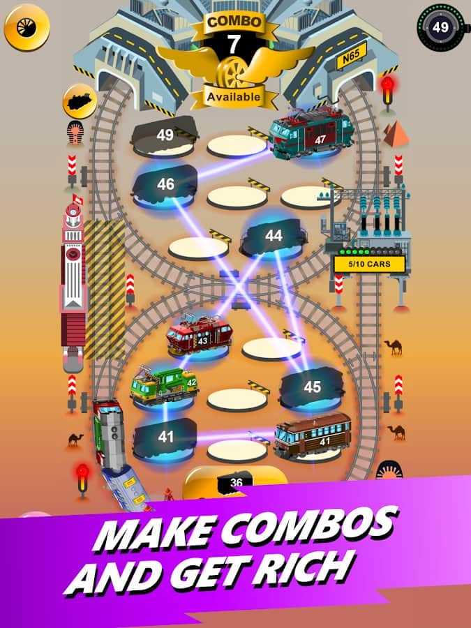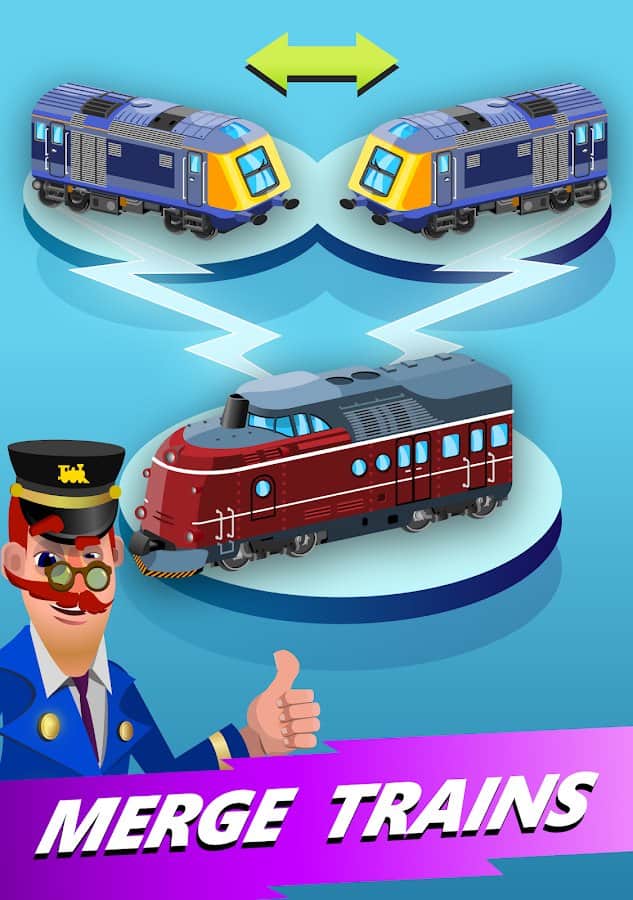 En Train Merger te convertirás en un magnate de los negocios y crearás nuevos trenes, con más de lo ordinario entre ellos. Desbloquea más de 60 modelos de trenes y gana más dinero para mejorar nuestras vías y edificios. Completa tareas y gana diferentes recompensas y mejoras. Además de las ubicaciones estándar en el juego, también hay desierto, bosque, montaña, piruletas, trópico, selva tropical, atardecer, Egipto, Antártida, China, México, Australia y otros.