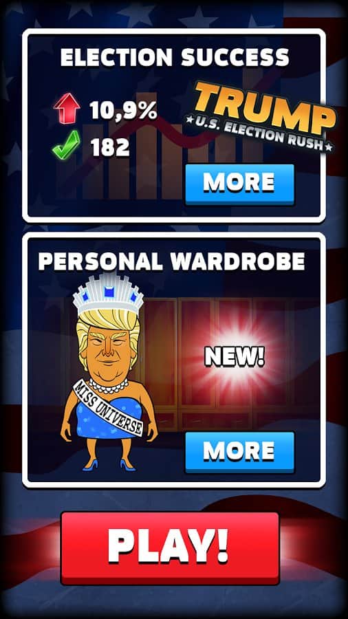 Trump. Carrera Electoral de EE. UU. – un juego divertido en Android, donde aceptas tu parte en la carrera de los candidatos a Presidente de América. En este juego controlarás la campaña presidencial del famoso millonario Donald Trump. En el juego debes aprender a pensar y a razonar como un millonario para obtener el máximo de votos y alcanzar el codiciado puesto. La carrera presidencial no es el trabajo más fácil de tu vida y para superar a los rivales y estar dos cabezas y hombros por encima de ellos, debes pensar como un político, ser audaz y atrevido, para conquistar los corazones de millones de votantes en todos los Estados. Demuestra todo lo que puedes y lleva a tu candidato a la victoria.