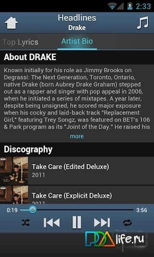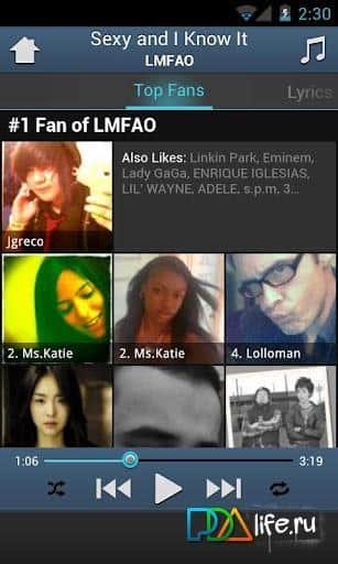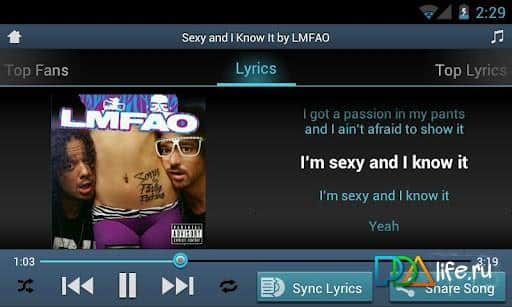 TuneWiki - Letras con Música. Genial reproductor de audio para Android. Soporta radio en línea y búsqueda de la canción en YouTube. Actualiza la información de la pista en línea. Incluye la búsqueda de las letras y las representa por línea de manera sincronizada con la reproducción en 40 idiomas. Hay un widget en el escritorio. Tiene sus propios servicios en línea.