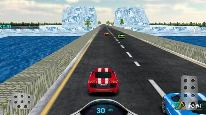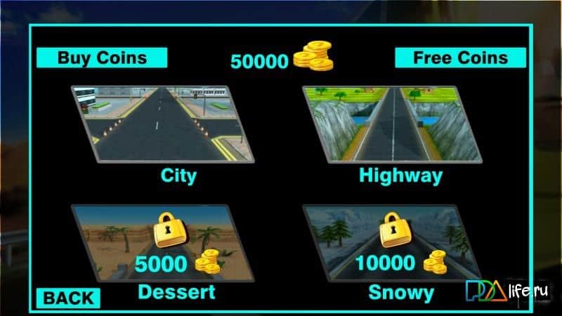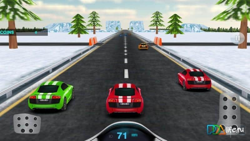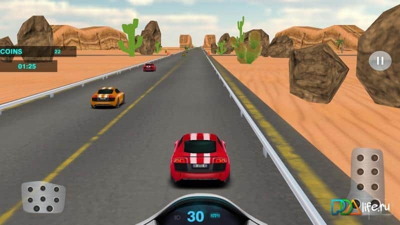 Turbo Speed Racer - Real Fast – toca y conduce a enormes velocidades en numerosos lugares del juego. En estas interminables carreras de arcade para Android, conducirás el vehículo, maniobrando en un flujo de transporte interminable tratando de pasar por la carretera en poco tiempo. No crees situaciones de emergencia en la carretera y en el camino recoge monedas de oro y bonificaciones que te ayudarán a acelerar o hacer que tu coche sea invisible. Conduce por las calles de la ciudad y las carreteras rurales y desiertos y obtén acceso a nuevos coches y niveles del juego. El juego cuenta con 2 modos de juego, 4 pistas únicas y numerosos coches rápidos.