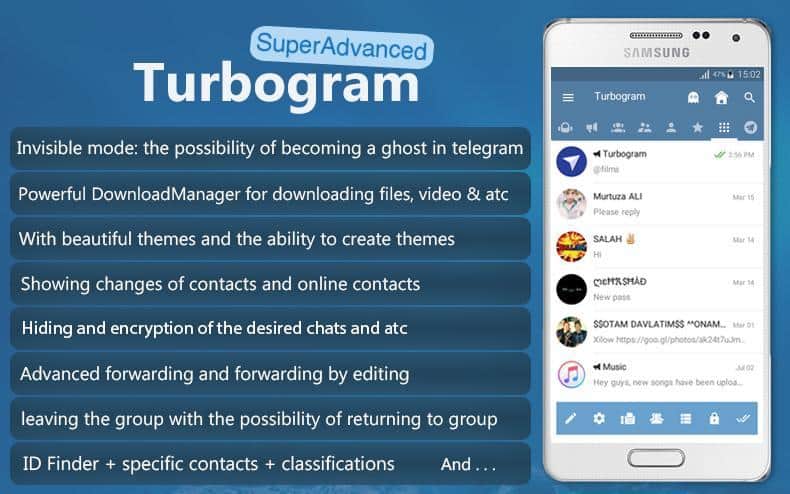 TurbogramPro Avanzado Telegram - Aplicación divertida que será un gran reemplazo para el telegram estándar. La funcionalidad de esta aplicación es muy similar a la estándar, sin embargo, está ligeramente expandida e incluye características divertidas como el modo sigiloso y un gestor para descargas de archivos. Además de esto, hay un muy buen editor con el que puedes cambiar la apariencia de tu telegram. En general, la aplicación es casi la misma que la estándar, pero con muchas adiciones divertidas y útiles.