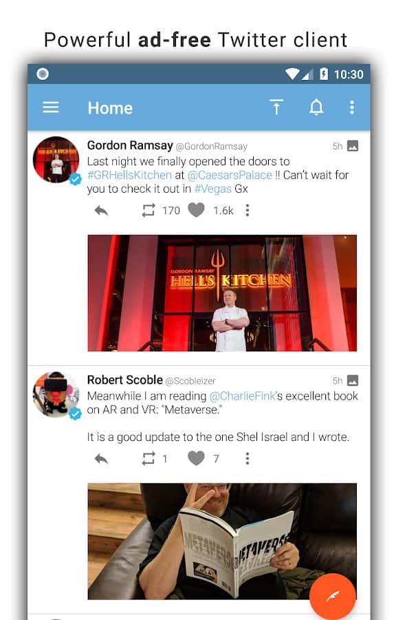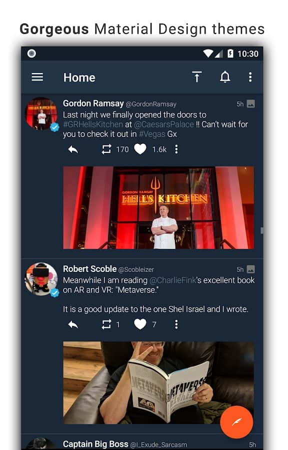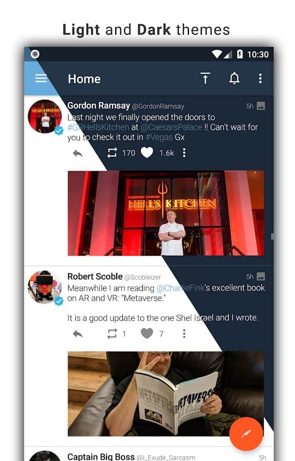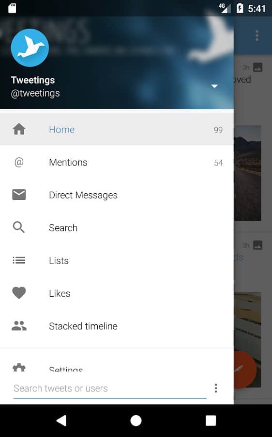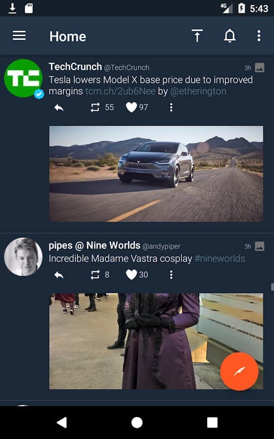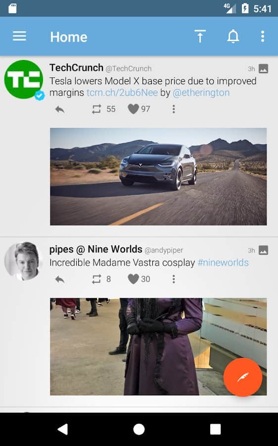 Tweetings para Twitter - Otra aplicación de Twitter para Android, tiene una vista hermosa. La aplicación admite temas, por lo que nunca te aburrirás de su apariencia. Puedes leer tus tweets favoritos y publicar los tuyos en uno de los clientes de Twitter más convenientes. El programa tiene un control fácil, en el que no tardarás mucho en entender.