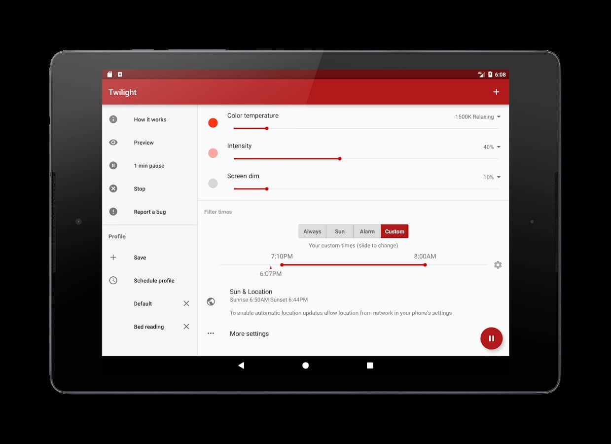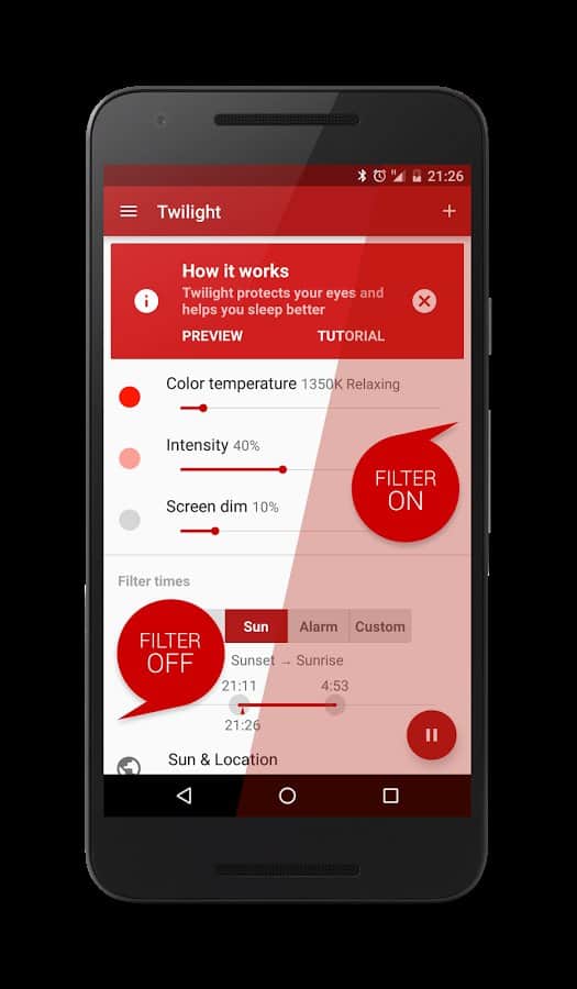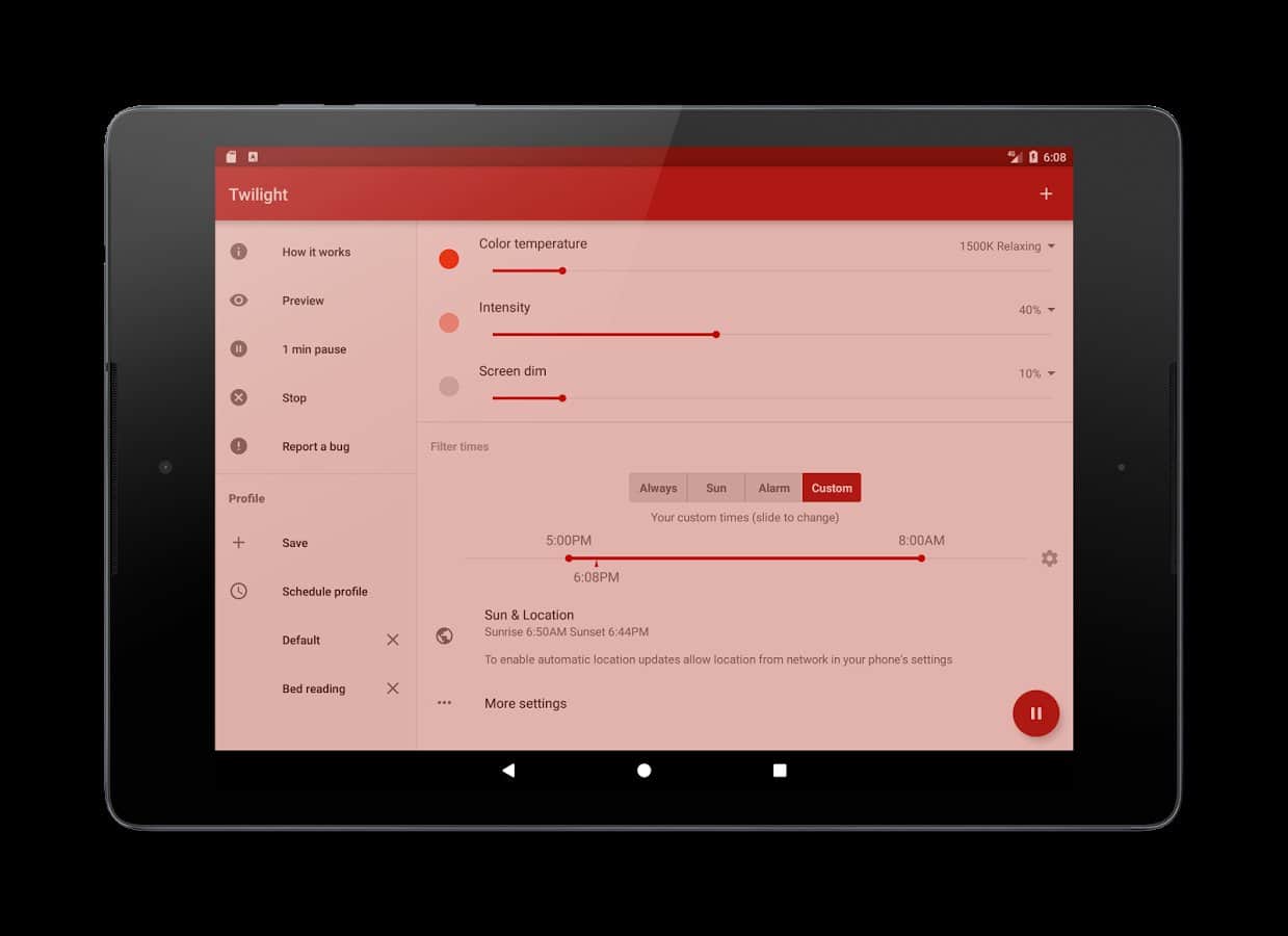 El crepúsculo - durante mucho tiempo los científicos han demostrado que la luz brillante afecta al cerebro humano, alterando así el ritmo de la vida. Has tenido un problema así, decidiste leer noticias en una tablet antes de dormir, luego la dejaste a un lado, y el sueño desapareció. Así que, debido a la luz que te golpeaba en el ojo, no querías dormir. Esta aplicación tiene como objetivo resolver este problema. Puedes configurarla de tal manera que a una cierta hora en una zona horaria específica, tu dispositivo cambie el brillo de la pantalla. Lo que hará será como tú quieras. De hecho, la aplicación es muy simple, pero puede salvarte un sueño saludable y la vista.