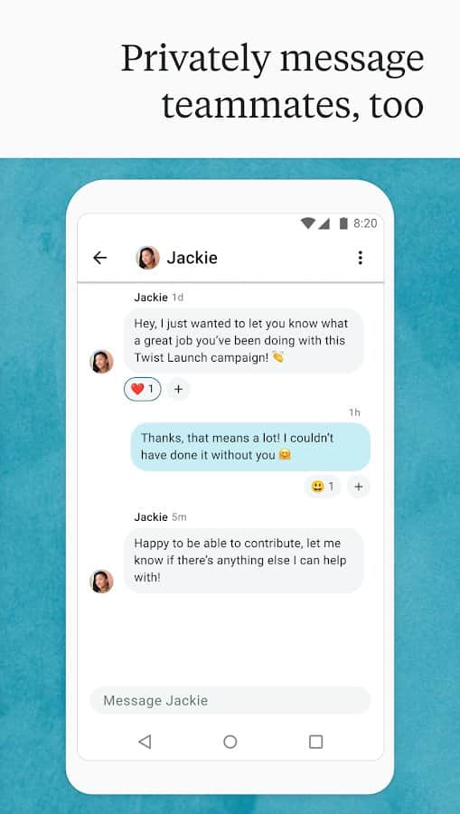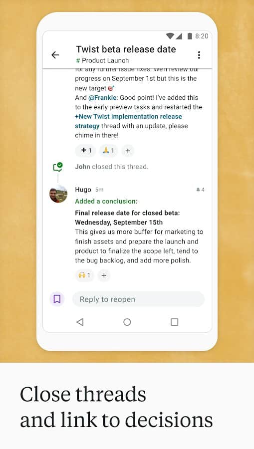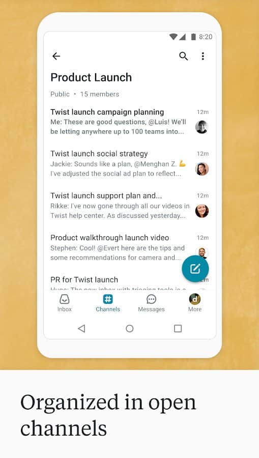 Twist: Mensajero de equipo - Organiza completamente el trabajo con tu equipo y crea un chat compartido donde cada uno de los empleados podrá escribir en línea. Ordena los hilos por canales, cierra los hilos y deja enlaces a sus conclusiones, comunícate con colegas en chats personales, sincroniza todos los mensajes y no te distraigas muchas veces con los mensajes entrantes. Ahora simplemente no podrás perderte algo importante, porque las nuevas notificaciones se mostrarán en la parte superior de toda la lista. Invita a nuevos usuarios a discutir proyectos comunes y desplázate por el historial de correspondencia para encontrar los detalles necesarios.