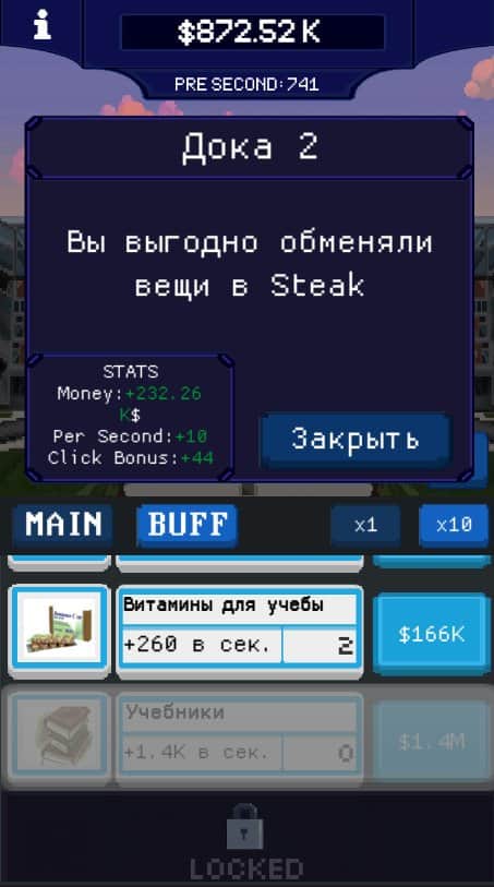 Clicker Universitario – un fascinante clicker en Android, donde jugarás el papel de un estudiante. Eres un estudiante regular y estudias en la universidad, pero desafortunadamente, tus estudios son muy difíciles. Tu única oportunidad de graduarte es sobornar al rector. Lo único en lo que eres bueno es en ganar dinero. Haz clic tan a menudo como sea posible en la pantalla de tu teléfono o tableta y gana dinero. Resuelve tareas desafiantes cada día, te sucederán diferentes eventos. Consigue dinero, mejora y obtén potenciadores y soborna al rector.