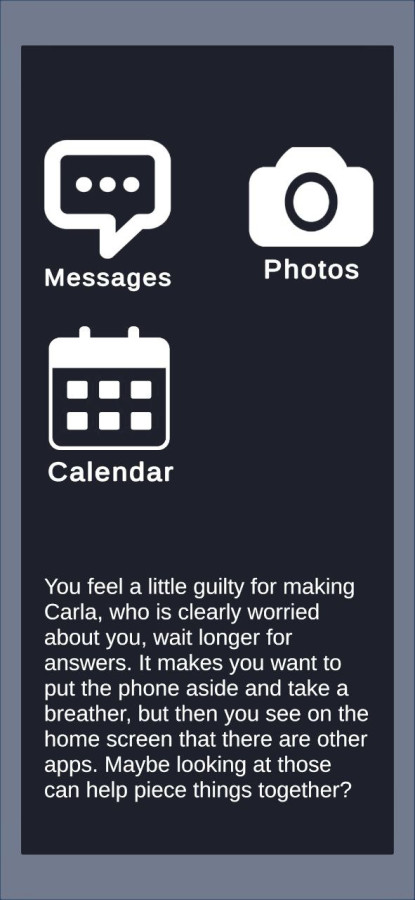 Unlocked — una breve pero conmovedora aventura narrativa donde toda la historia está oculta dentro de un smartphone. Al despertar en el hospital tras un accidente, pierdes la memoria y la única conexión con tu pasado es tu teléfono. Abre las aplicaciones, lee mensajes, revisa fotos y el calendario, recuperando paso a paso tu propia vida. Una interfaz realista, una atmósfera inquietante y una sutil presentación de la trama convierten acciones cotidianas en una investigación emocional, donde la verdad resulta ser mucho más compleja de lo que parece en la pantalla.