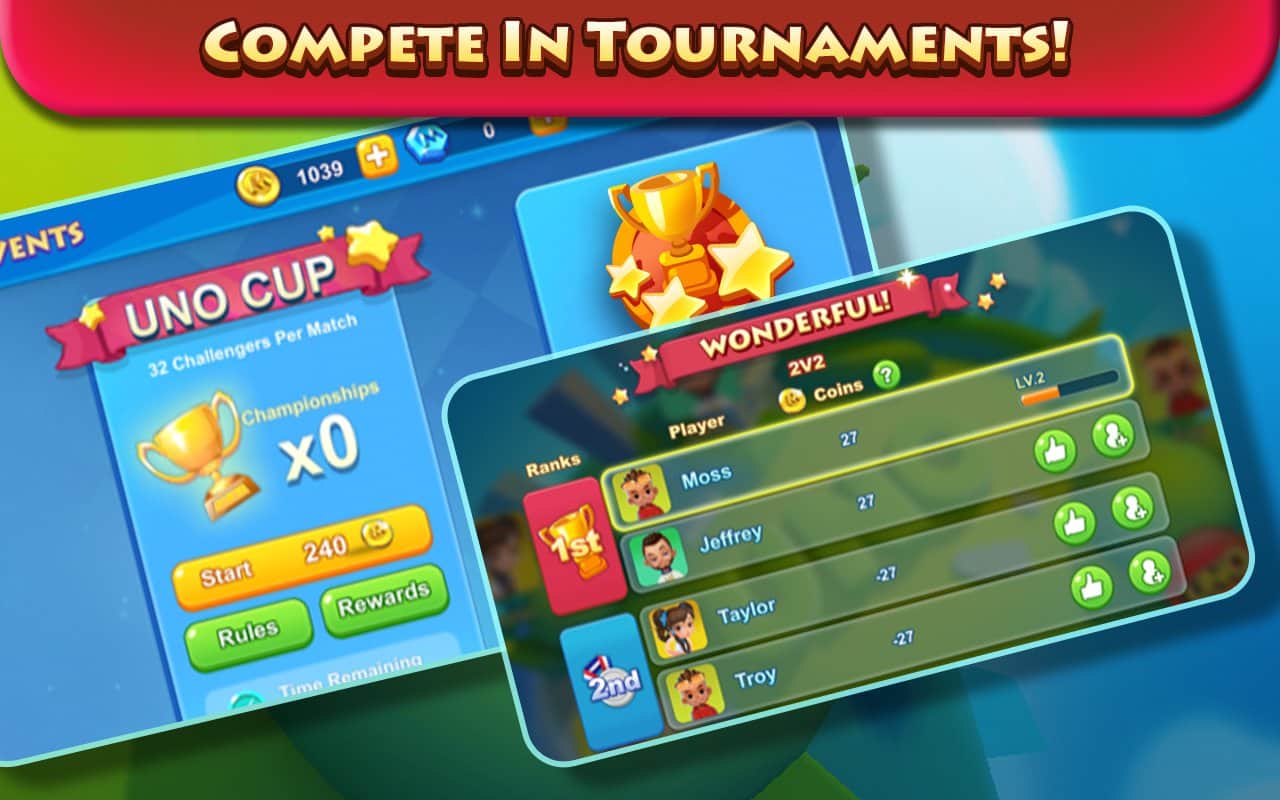 ¡UNO! – emocionantes juegos de mesa en Android, ahora ha cambiado más allá del reconocimiento. En este juego te esperan nuevas reglas, torneos, aventuras y más. Juega a este juego en cualquier momento libre y diviértete. Este juego es perfecto tanto para jugadores experimentados como para novatos. Este moderno juego de cartas está diseñado para toda la familia, en el que recibirás recompensas y bonificaciones.
