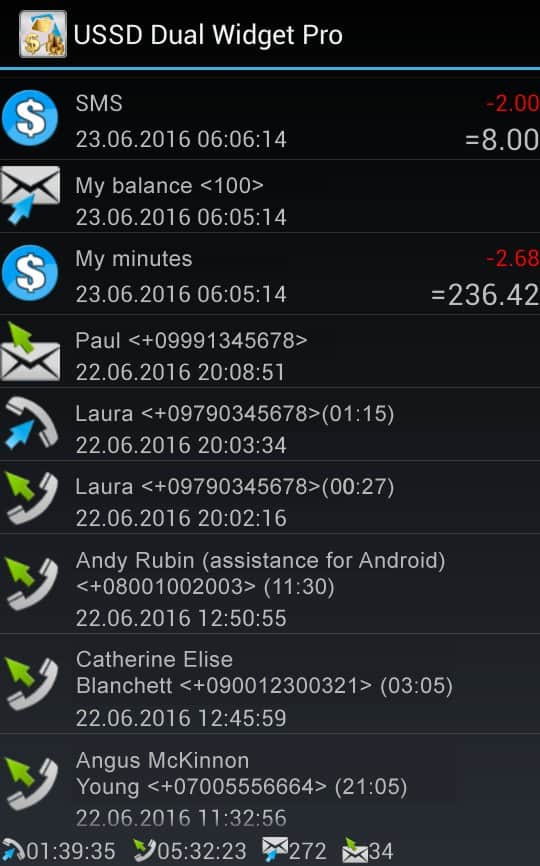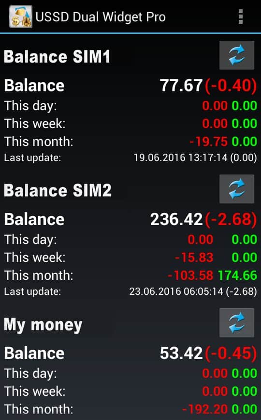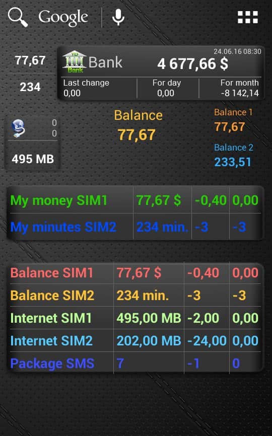 USSDDualWidgetPro - aplicación para rastrear el saldo del dispositivo Android. Una amplia gama de posibilidades y funcionalidades permitirá a cada usuario personalizar la aplicación según sus necesidades, y dado que USSDDualWidgetPro está completamente en español, no será un gran esfuerzo. También vale la pena mencionar la amplia variedad de widgets y métodos de notificación, así como la posibilidad de trabajar con dos tarjetas SIM, algo que no es común en aplicaciones similares.