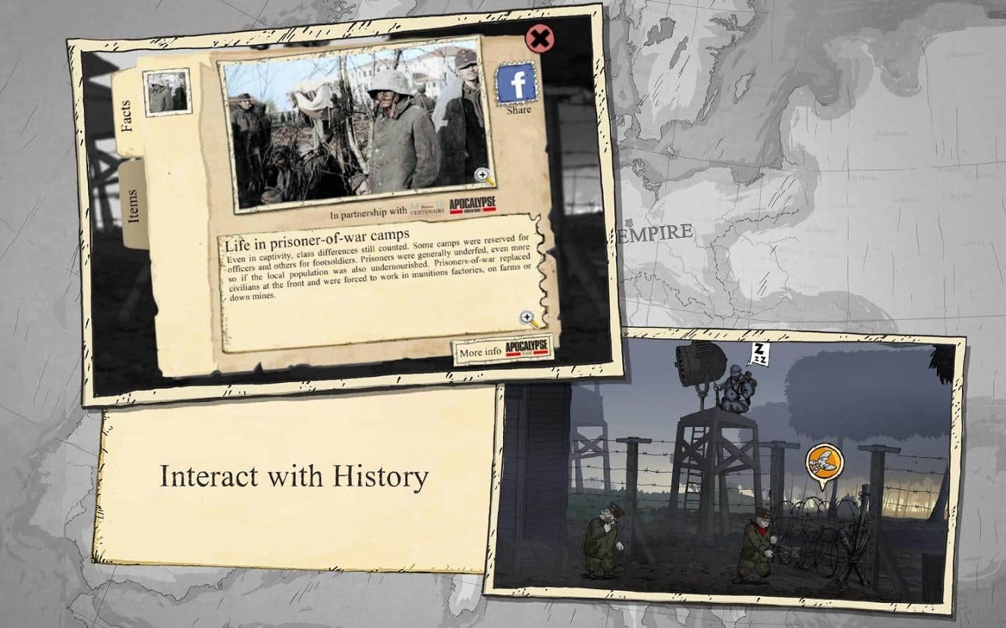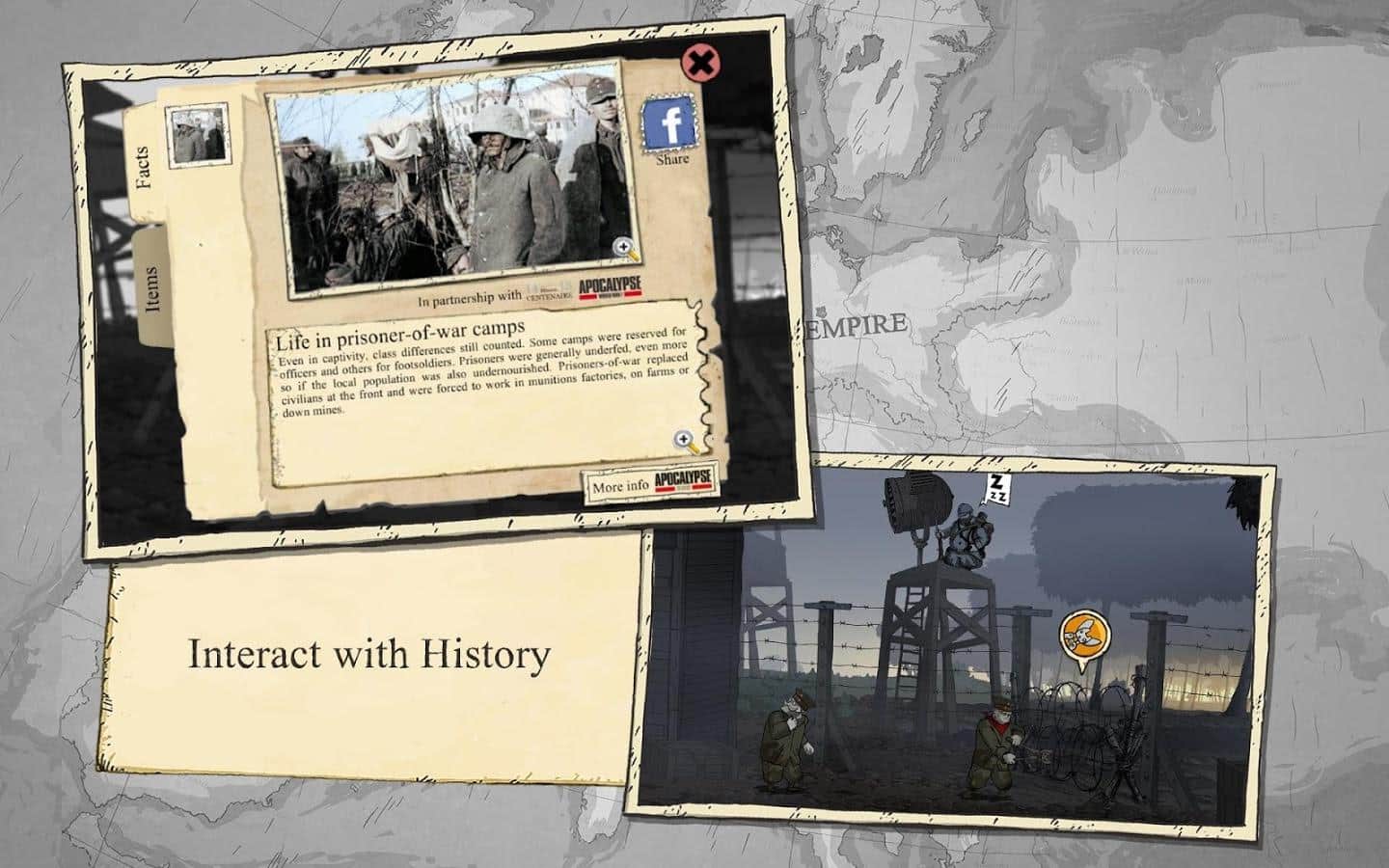 Valiant Hearts: La Gran Guerra es un juego de aventura con un diseño excepcional. ¡Sumérgete en la atmósfera aterradora de la Primera Guerra Mundial! Ayuda a tus héroes a sobrevivir en un momento difícil resolviendo acertijos y abriéndose camino entre las trincheras y la trinchera detrás de las líneas enemigas. Tu fiel asistente será el perro Walt. La trama del juego es ficticia, pero puedes visitar algunos sitios famosos reales y observar las batallas importantes en el frente occidental.