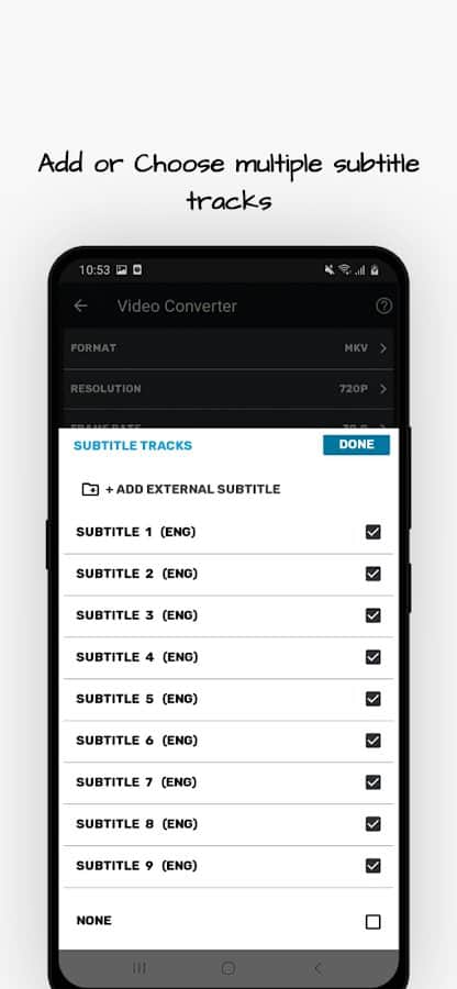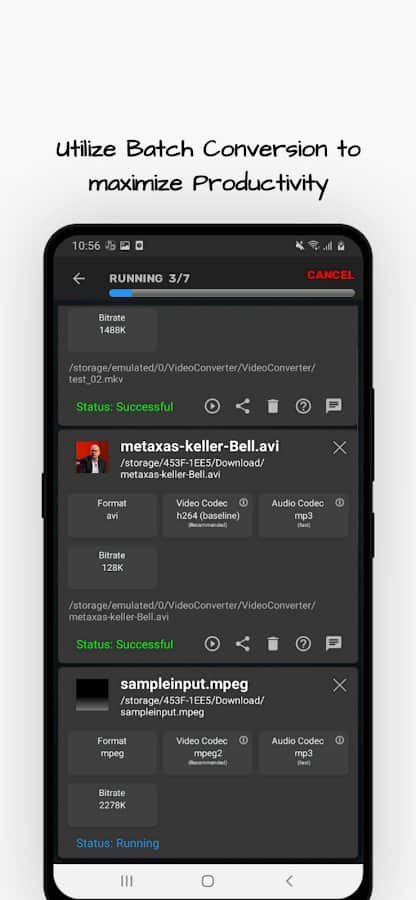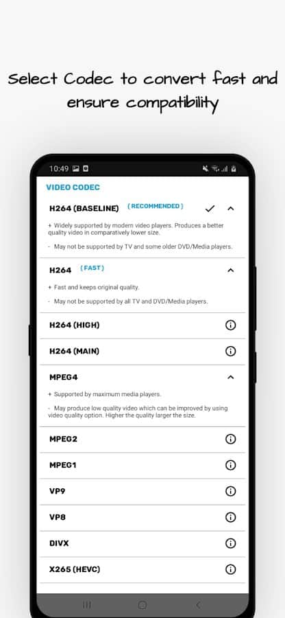 La aplicación Convertidor de Video te permite convertir y comprimir formatos de video MP4, MKV, AVI, MPEG, 3GP, MTS, MOV, MPG, WMV, M4V, VOB, FLV en archivos de video y audio.