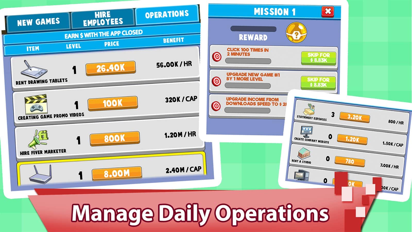 Tycoon de desarrollo de juegos - Comenzando con un pequeño estudio como un lugar para el desarrollo de juegos, muy pronto podrás desarrollar tu propio negocio y expandirte significativamente tanto en territorio como en número de empleados. Crea juegos únicos desde cero: completa tus tareas, diseña íconos para mostrar en sitios web, verifica regularmente las estadísticas de descargas y datos adicionales, y obtén retroalimentación, aunque no siempre sea positiva. Llega a un nivel en tu carrera donde puedas ganar ingresos pasivos todos los días!