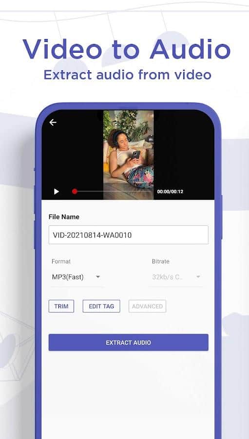 Convertidor de Video a Mp3 - haz cualquier cosa con tus archivos de video: recórtalos, corta momentos innecesarios, une varios videos en uno, conviértelos de MP4 u otro formato a audio, es decir, MP3. En la aplicación puedes subir videos en formato MP4, AVI, MKV, FLV, WMV, 4K, y exportar en MP3, AAC, M4A o en su forma original. Usa música y archivos de audio como tono de llamada, un tono de llamada de un despertador o al recibir una nueva notificación. ¡Recibe archivos automáticamente y utiliza todas las funciones que están disponibles para ti!