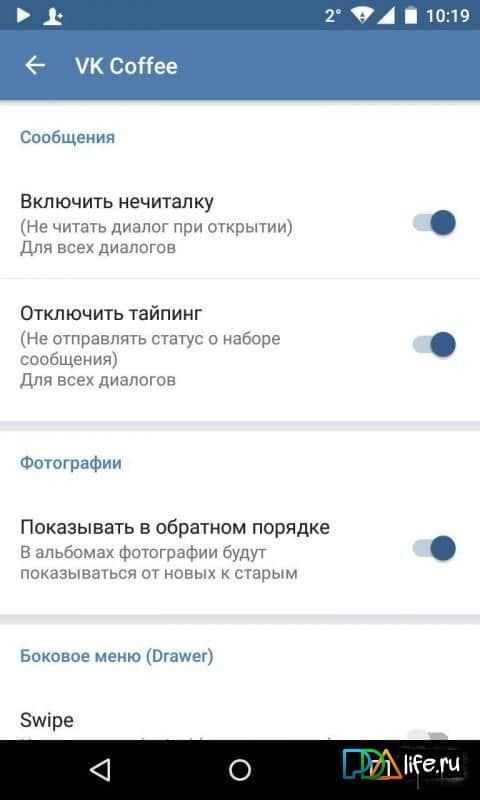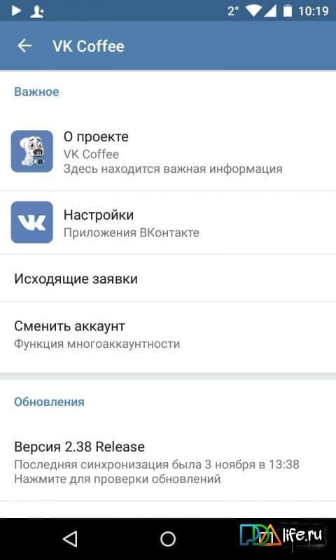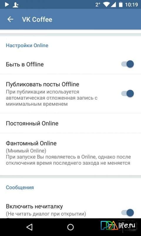 VK Coffee es una modificación del cliente oficial VK. Esta modificación se diferencia del original si miras su funcionalidad. Este cliente tiene algunas características divertidas, por ejemplo, puedes ponerte en modo online eterno, publicar publicaciones en modo offline, la capacidad de establecer códigos para cada menú de tu perfil y más te espera en este cliente modificado. Lo curioso es que esta modificación es más estable que el original, y tiene muchas más funciones. No puede menos que alegrar la presencia de la posibilidad de cambiar muchas cuentas entre sí.